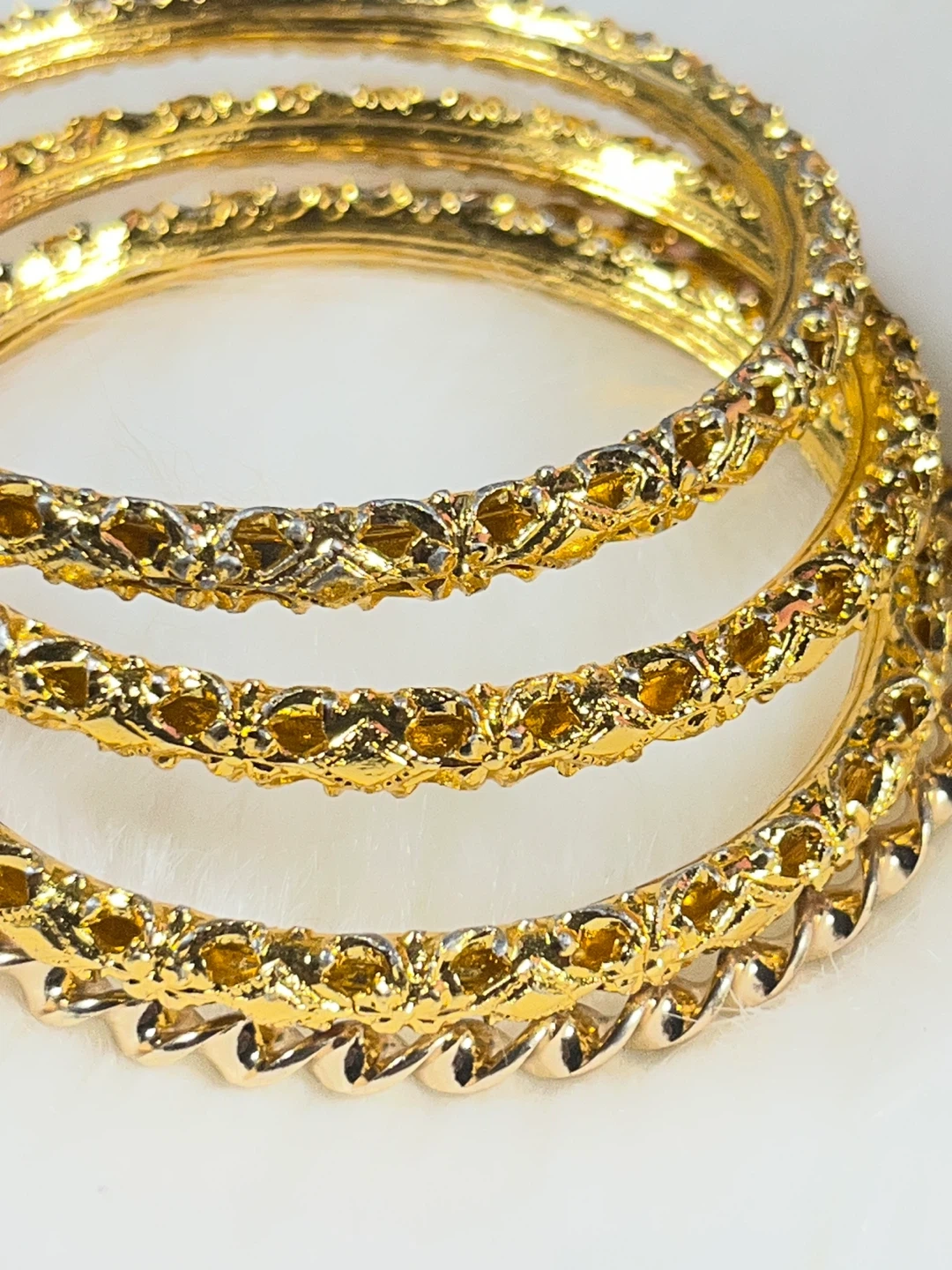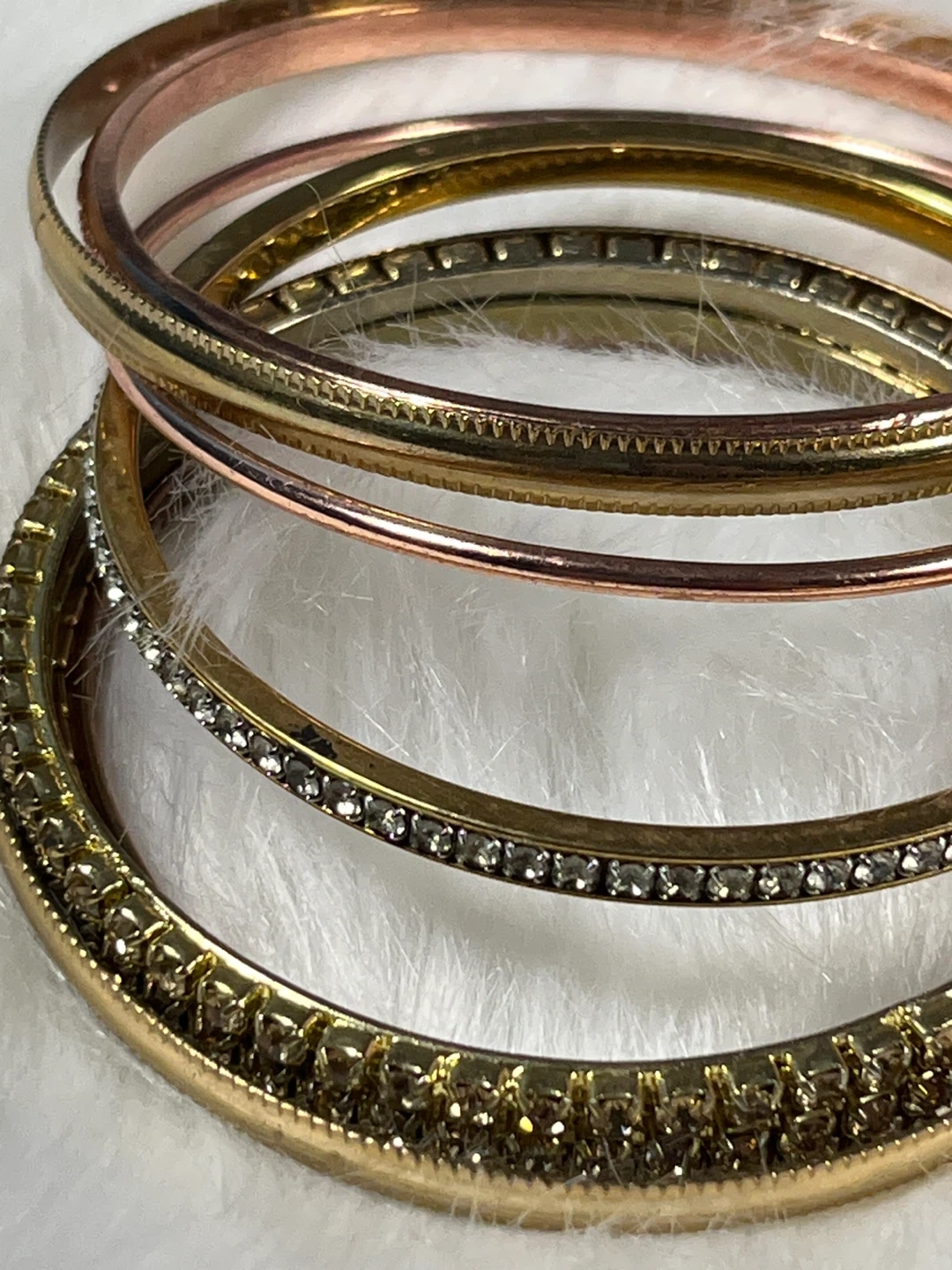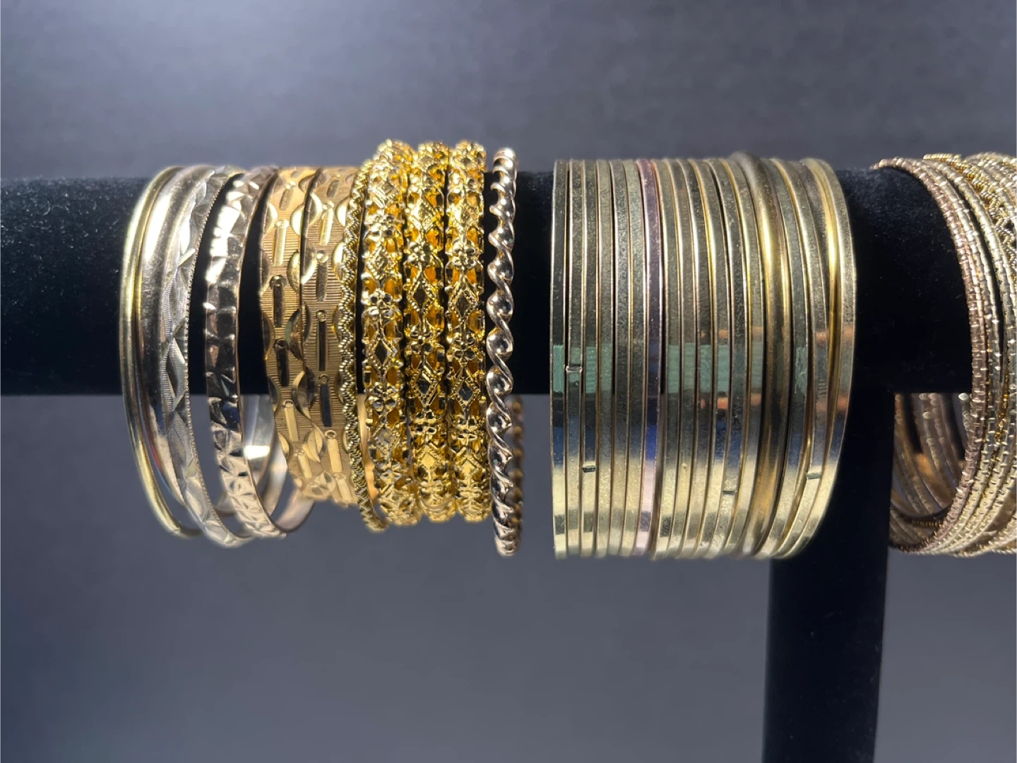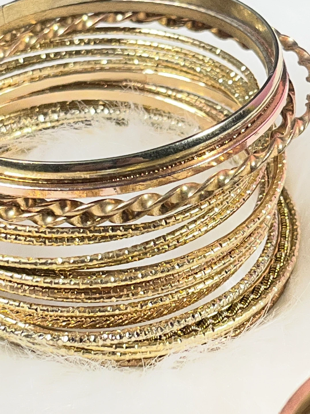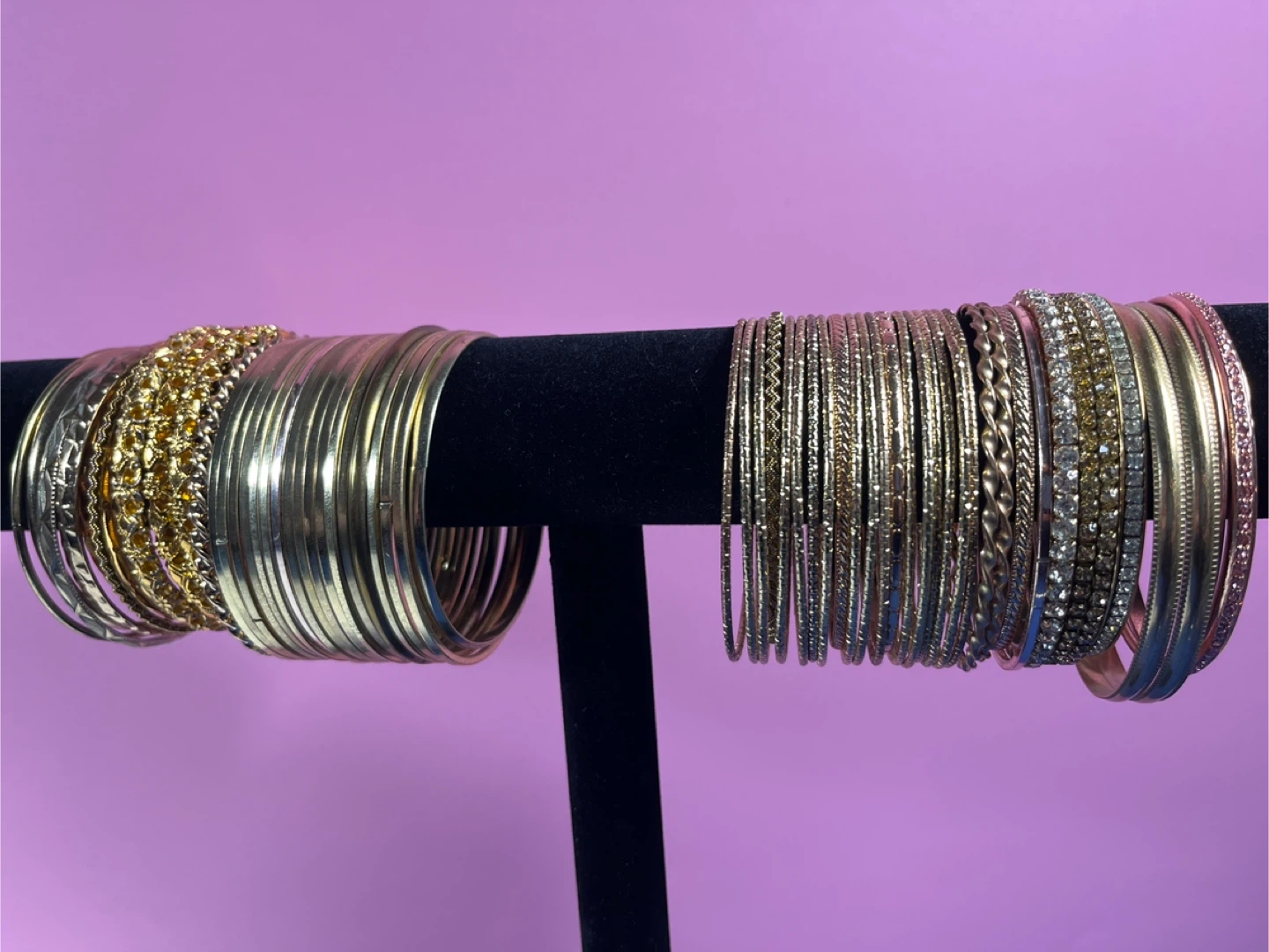 This is a set of 62 assorted bangles in various gold tones. It includes plain, textured, and jeweled designs. These bangles add a touch of sparkle to any outfit! ALL FOR $20