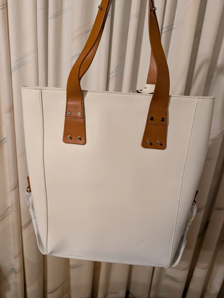 This is a brand new Alexander McQueen Kingsland tote bag in a bleach white PU finish with tags on. It features contrasting tan leather handles and a debossed McQueen logo. This spacious tote is perfect for everyday use or as a stylish travel companion. Minor blemish in material shown in photo 5. Comes with bag cover.