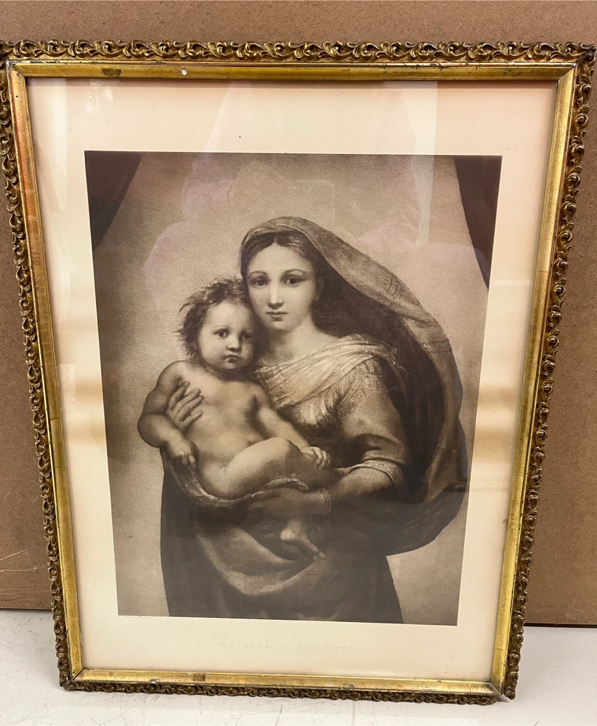 Framed print of "Madonna con Bambino". Features a decorative gold-tone frame. Backing is made of wood.