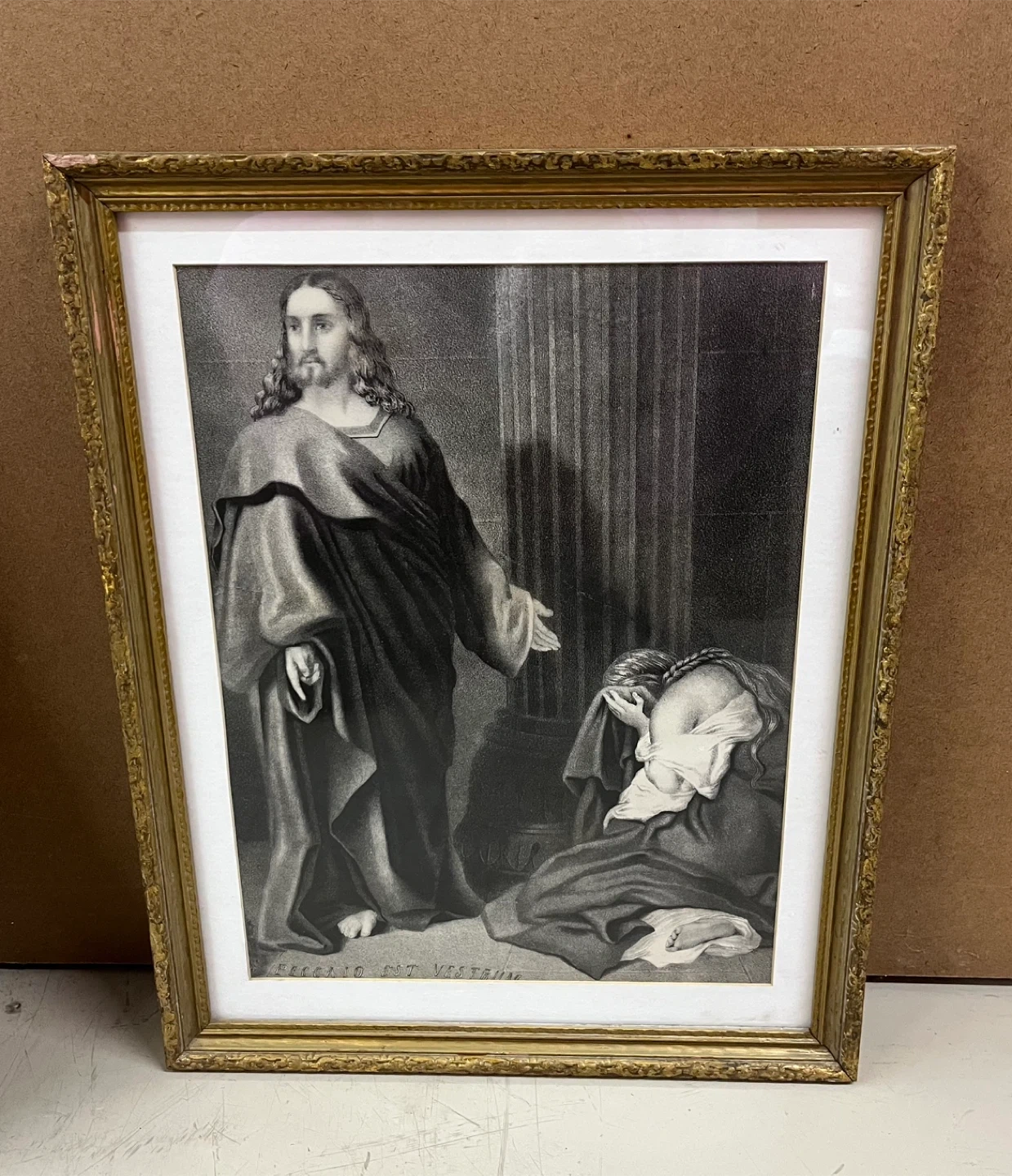 Framed artwork depicts Jesus and a weeping woman. The piece is matted and housed in a decorative gold-toned frame. Restoration of Fine Art Works is indicated on the backing paper.