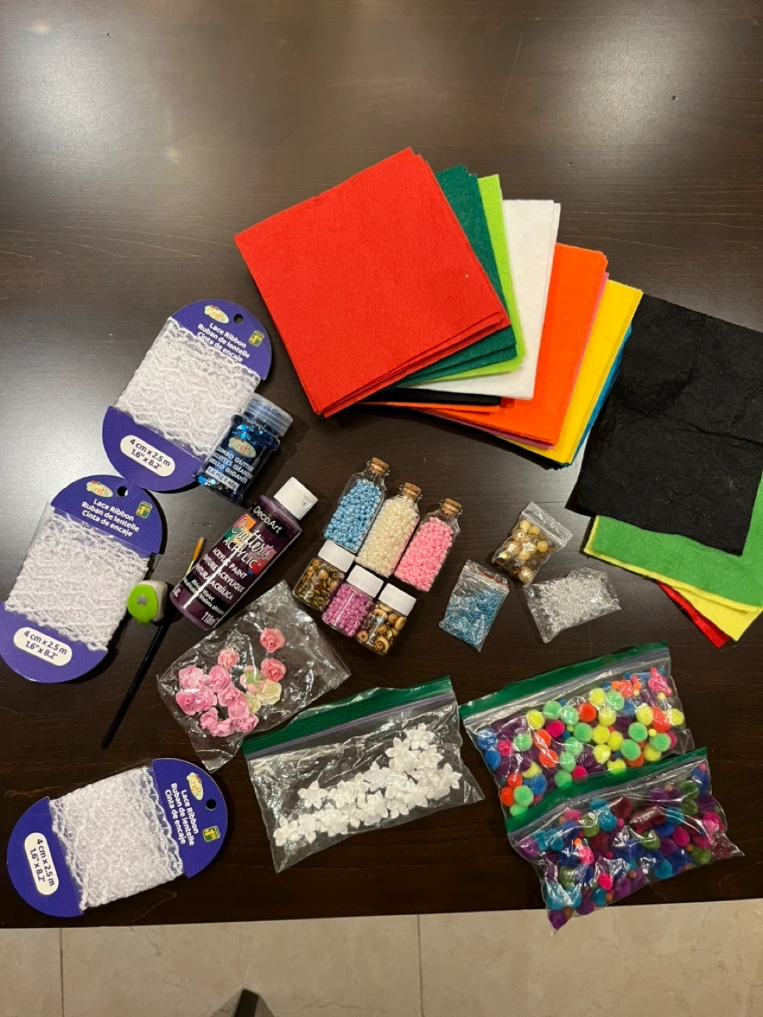Includes various craft supplies such as lace ribbon, felt squares, pom poms, beads, and acrylic paint. Lots of fun materials for crafting projects!
