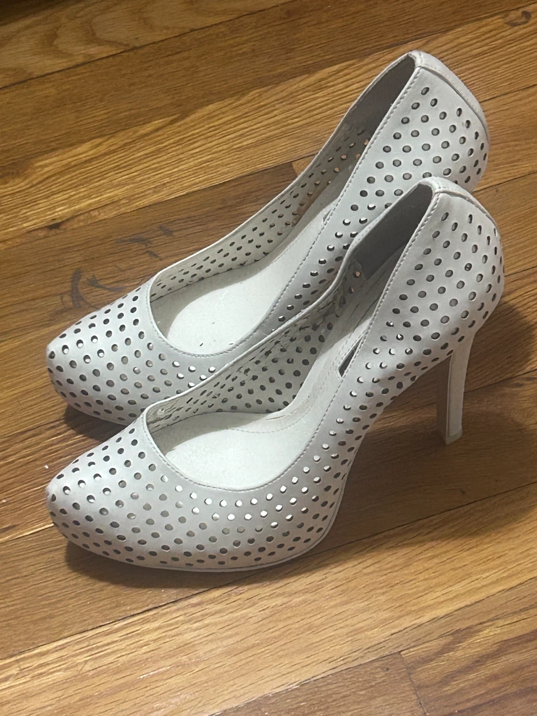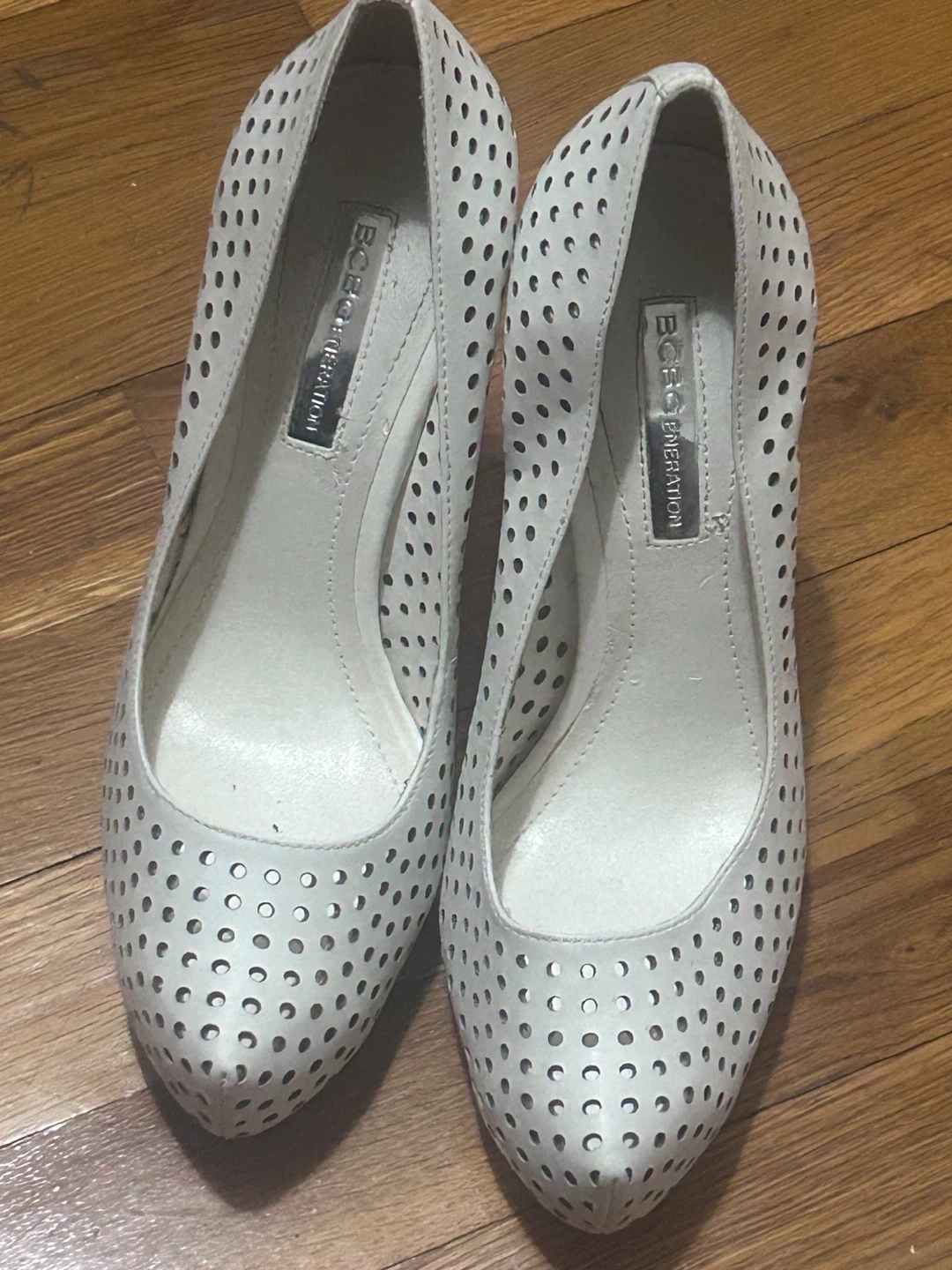BCBGeneration white heels with a perforated design. These stylish pumps feature a stiletto heel. Material appears to be faux leather.