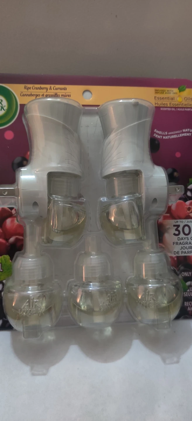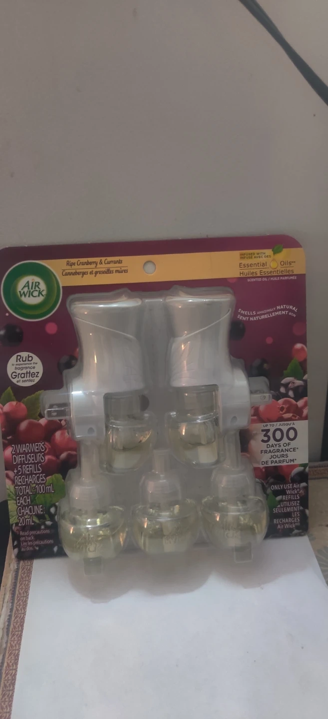 This Air Wick starter kit includes 2 warmers and 5 refills. Each refill contains 20 ml of Ripe Cranberry & Currants scent. Enjoy up to 300 days of fragrance!