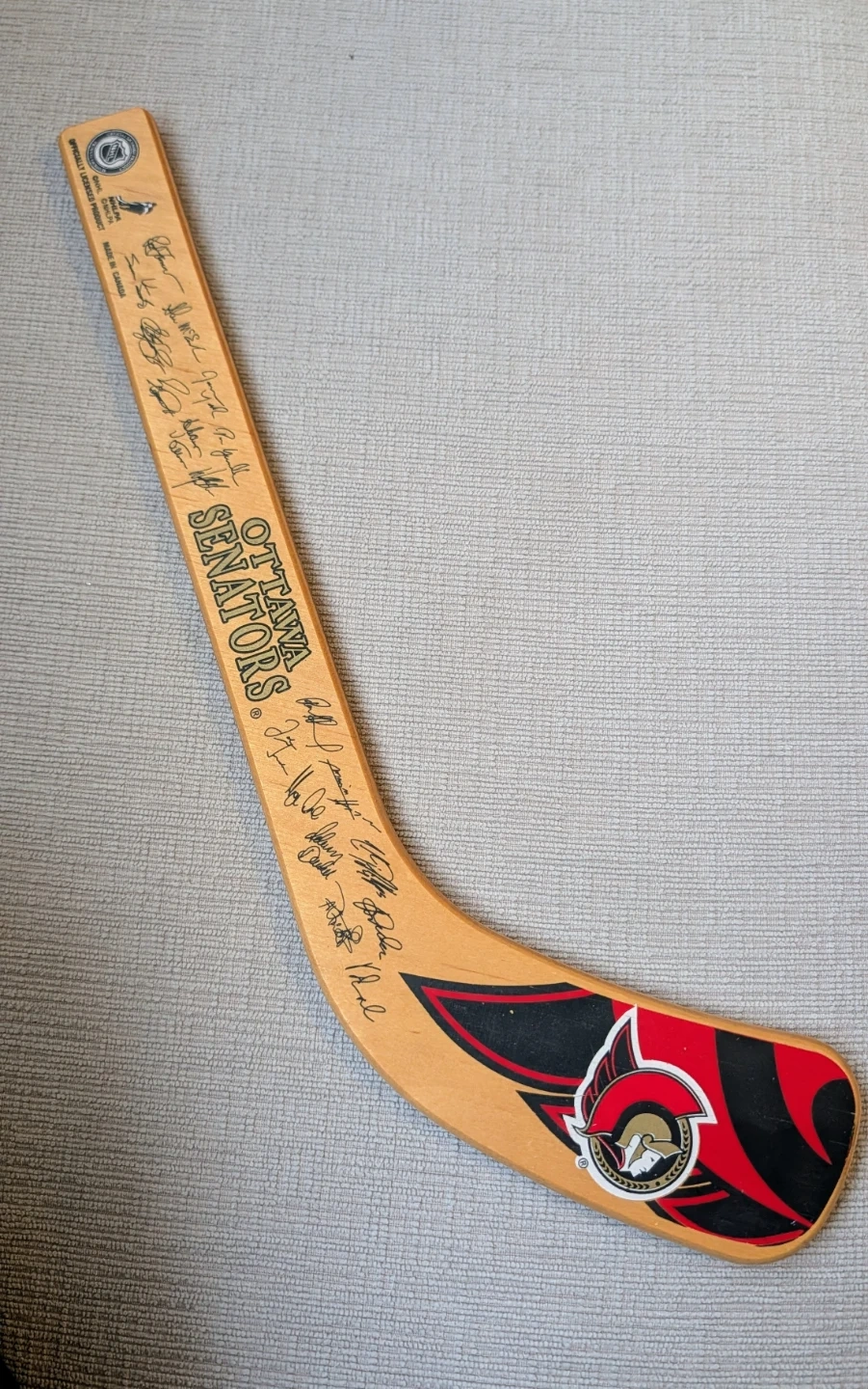 This is an officially licensed Ottawa Senators mini hockey stick. It's made in Canada and features multiple player autographs. A great collectible for any Senators fan!