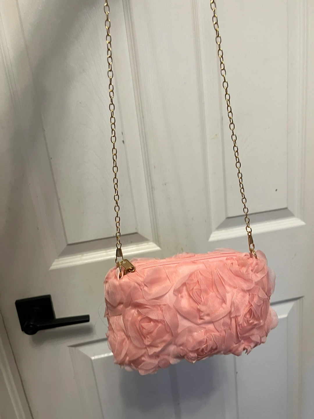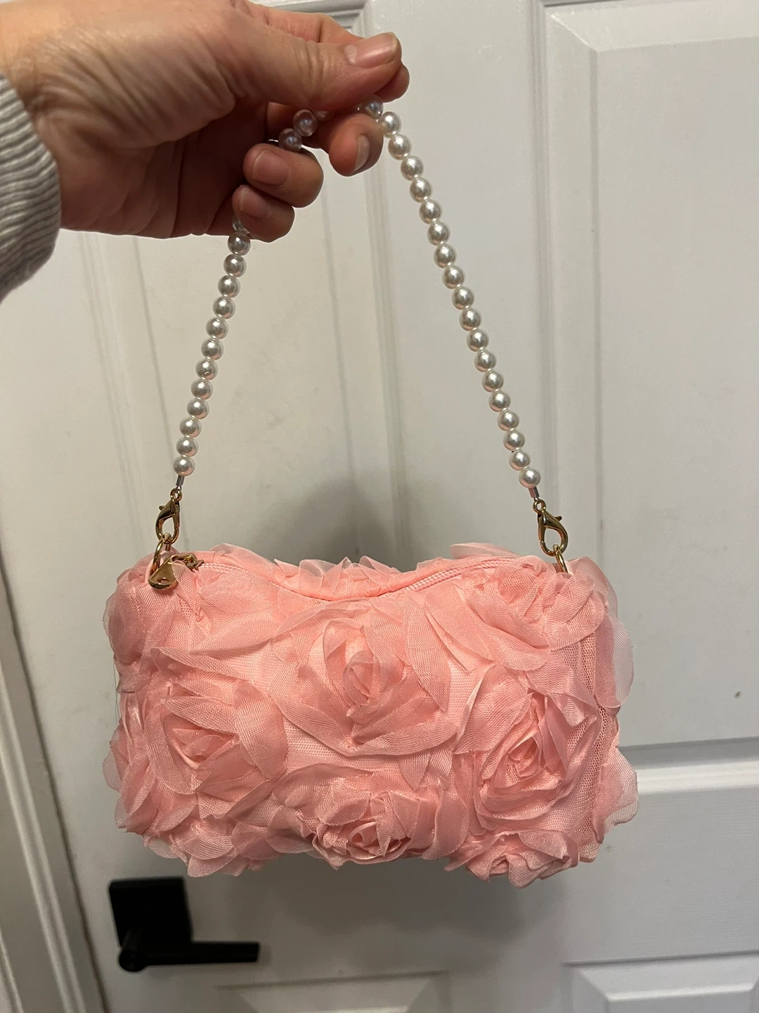 This cute pink clutch purse is covered in fabric roses. It comes with a detachable gold chain strap and a pearl beaded handle. It's perfect for a night out or a special occasion!