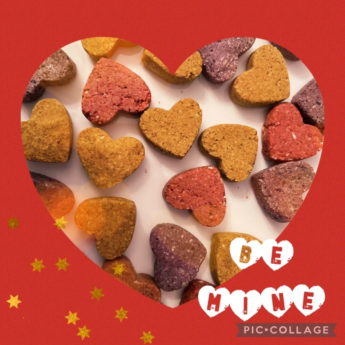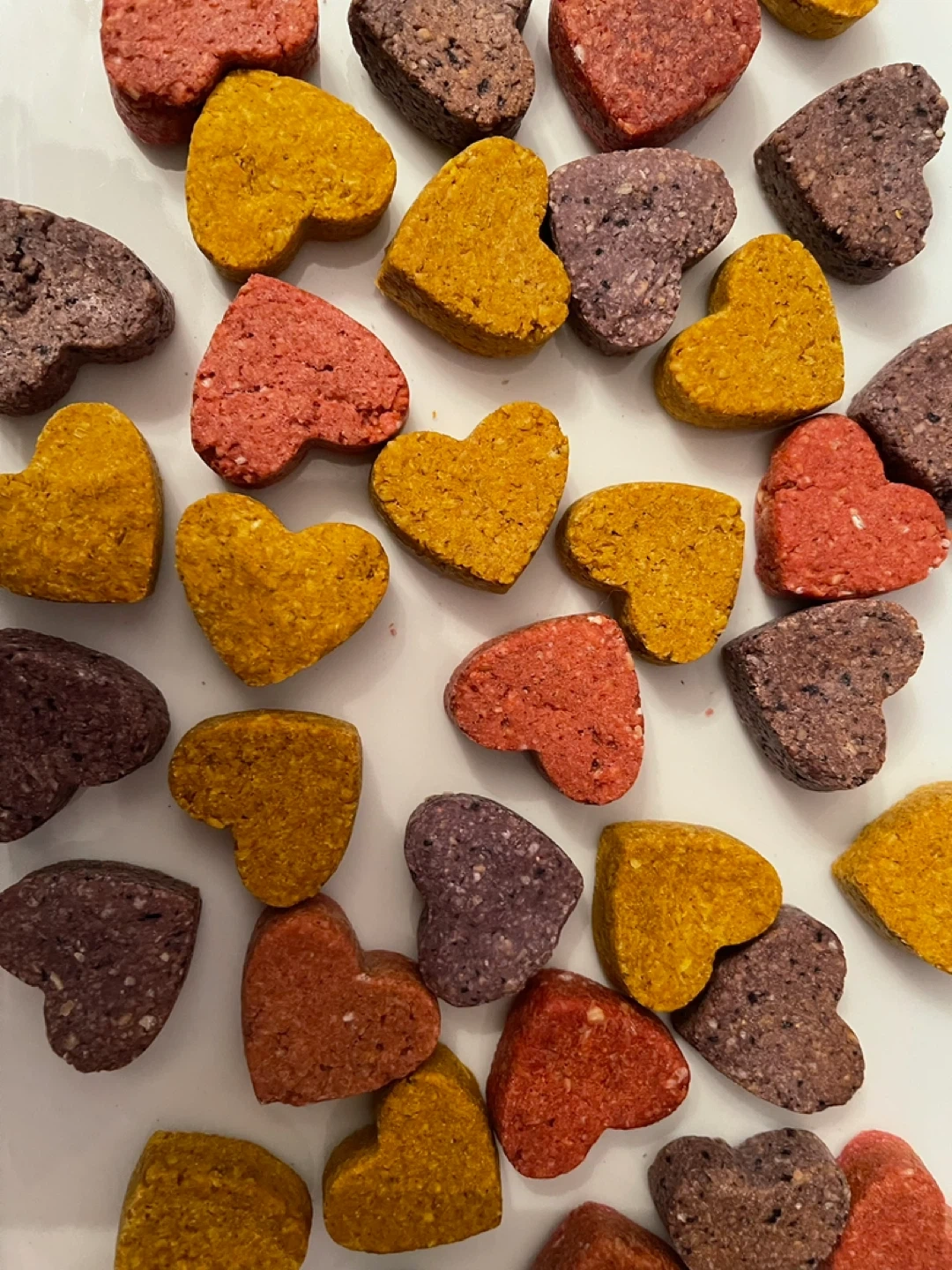 All-natural dog treats made with oats, eggs, blueberries, beets, apple sauce, natural peanut butter, pumpkin, ginger, turmeric and coconut oil. These heart-shaped treats contain no additives or preservatives. They're great for rewarding your furry friend!