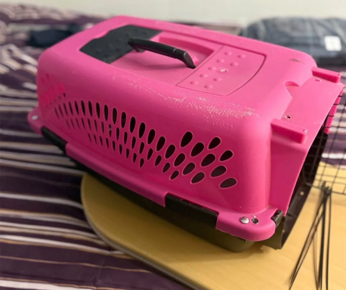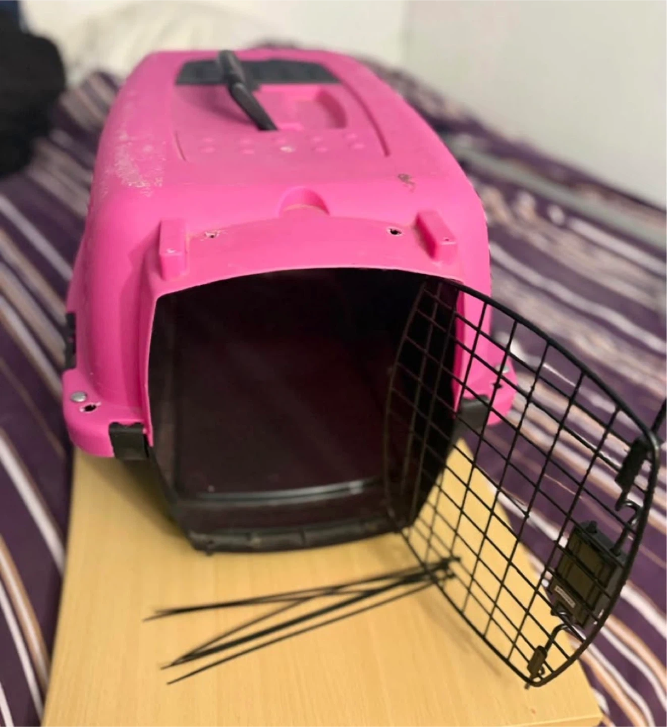 This is a pre-owned pink pet carrier with a black wire door. It features ventilation on the sides and a top handle for easy carrying. It's suitable for small to medium-sized pets. Airplane approved. Come with 6 zip ties to complete package