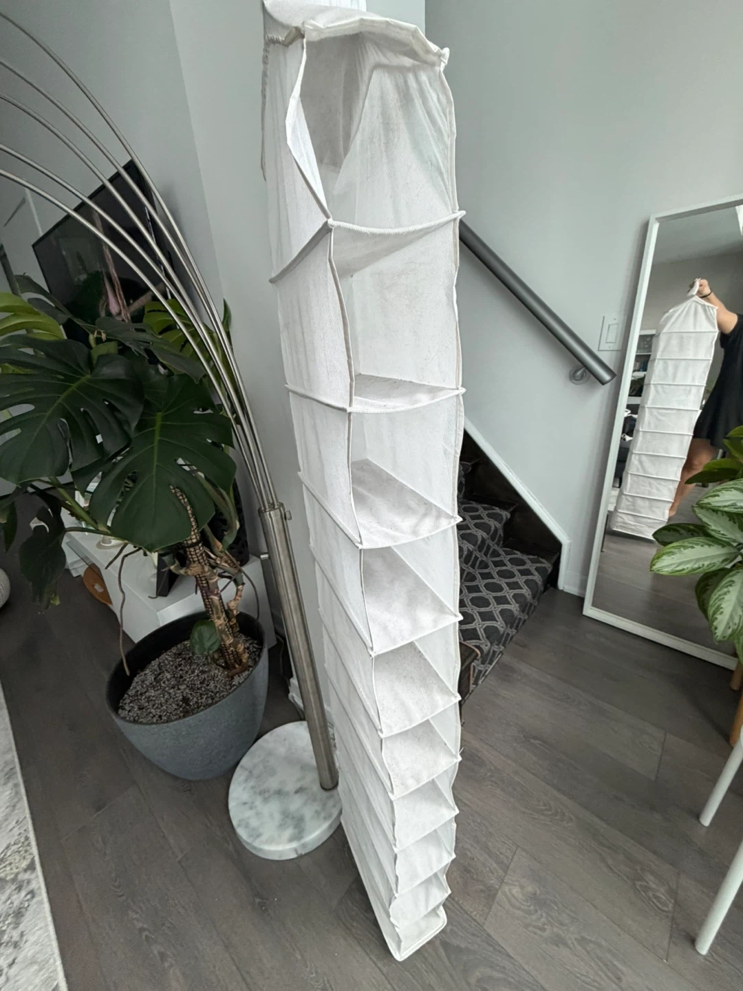 This is a white fabric hanging closet organizer. It has multiple shelves for storage. Great for keeping closets tidy!