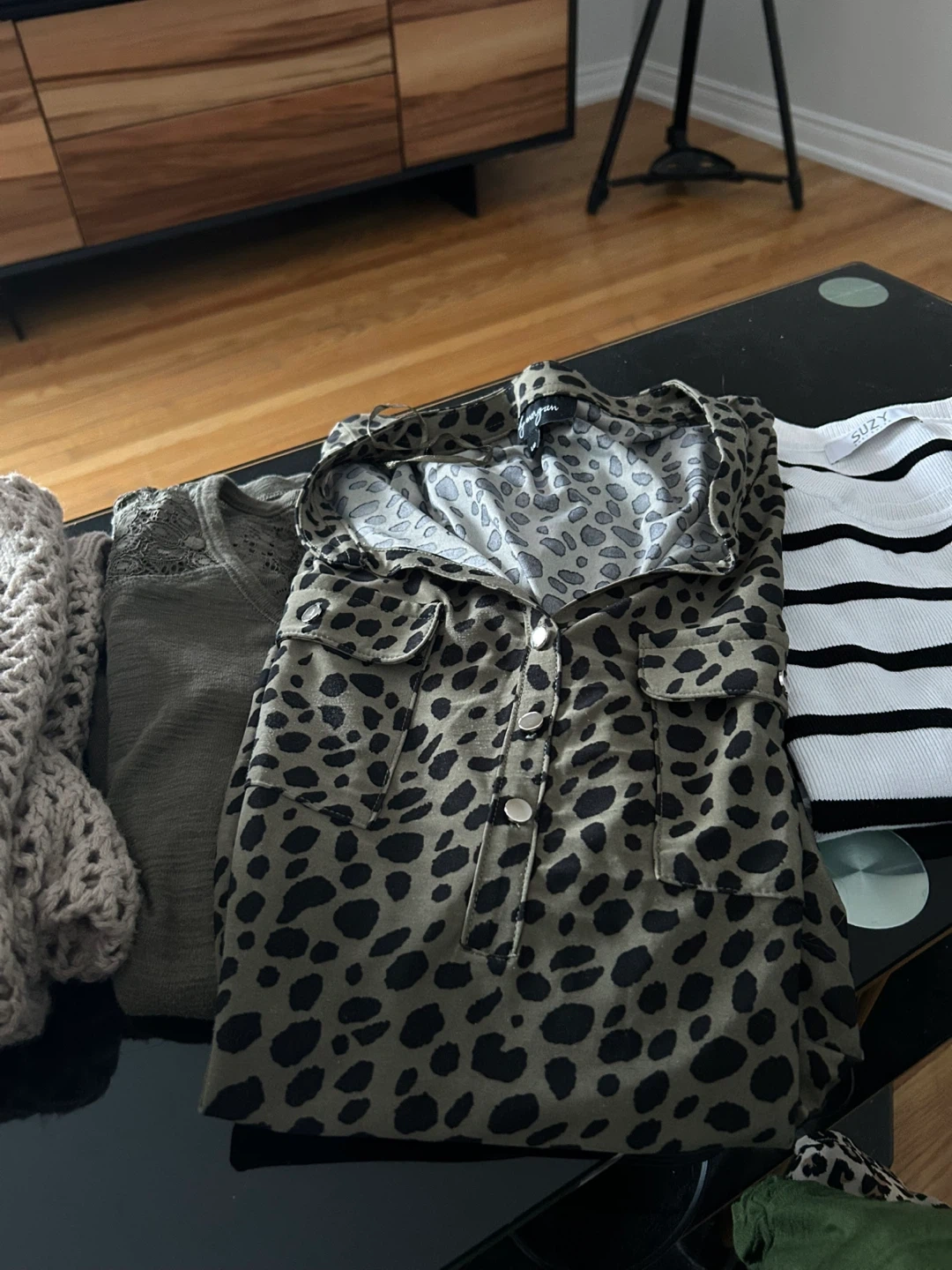 This bundle includes various women's clothing items. Features a light blue V-neck t-shirt and a black pair of pants tagged at LG. Also includes a leopard print button-up shirt and a striped knit top.