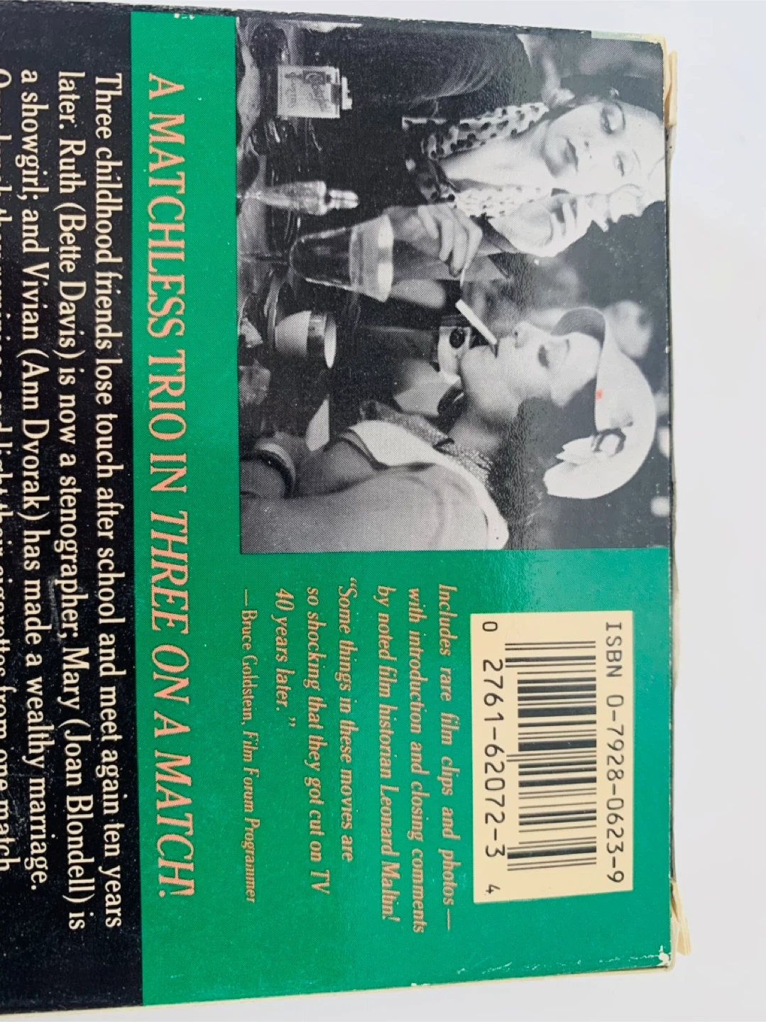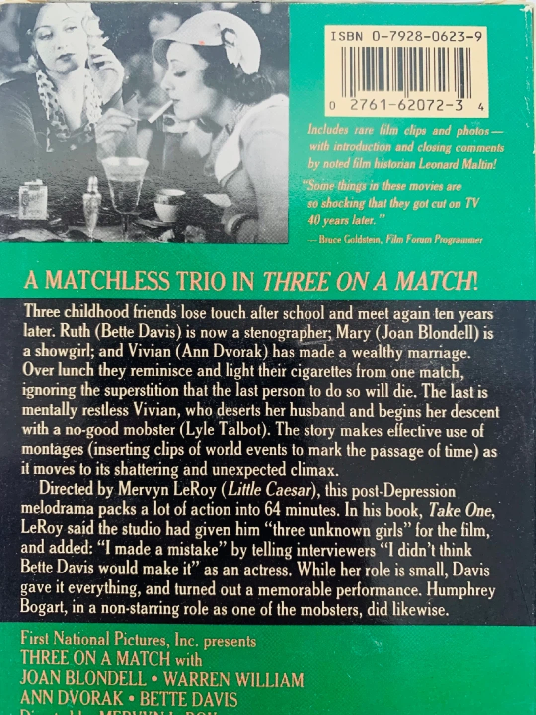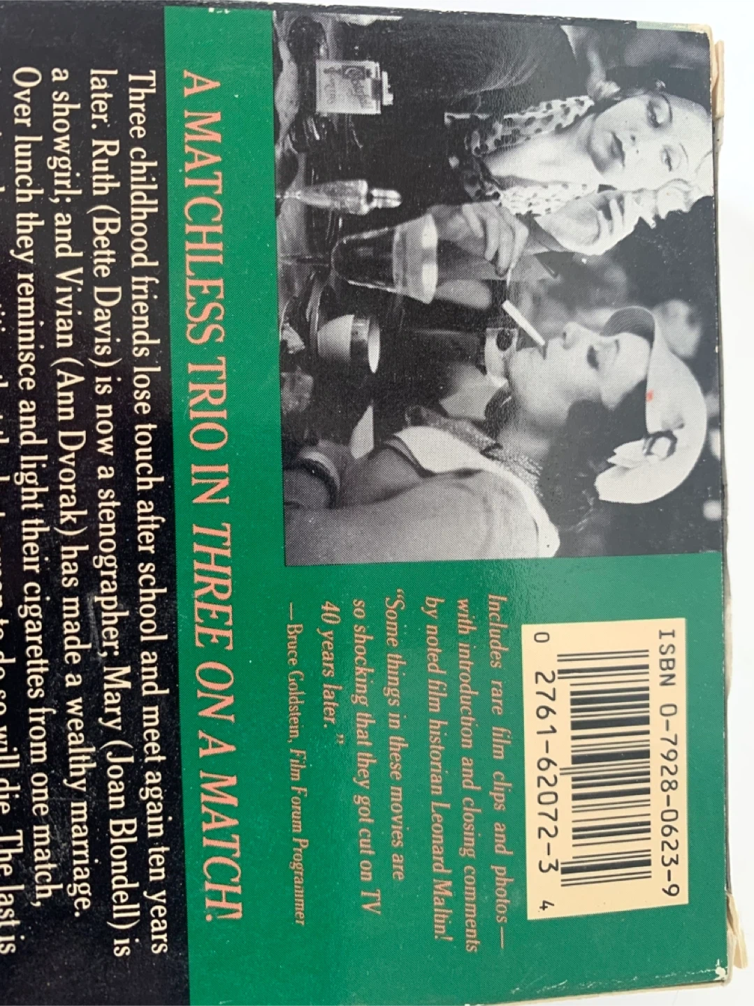 This VHS tape features the 1932 film "Three on a Match" starring Bette Davis, Joan Blondell, and Ann Dvorak. It's presented in black and white with a running time of 1 hour and 4 minutes. Includes rare film clips, photos, and closing comments by noted film historian Leonard Maltin. "Some things in these movies are so shocking that they got cut on TV 40 years later." - Bruce Goldstein, Film Forum Programmer.