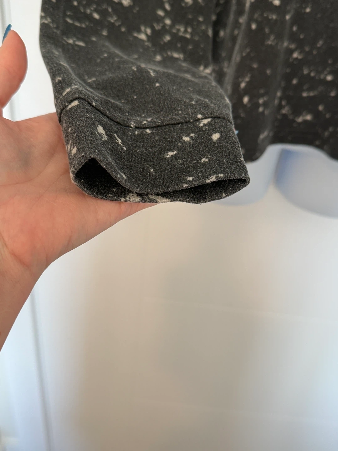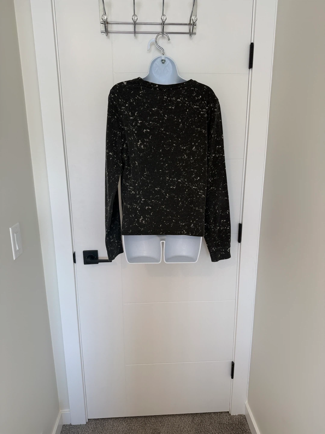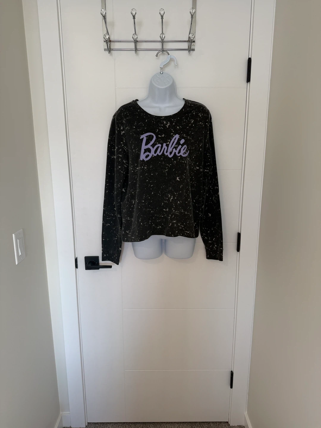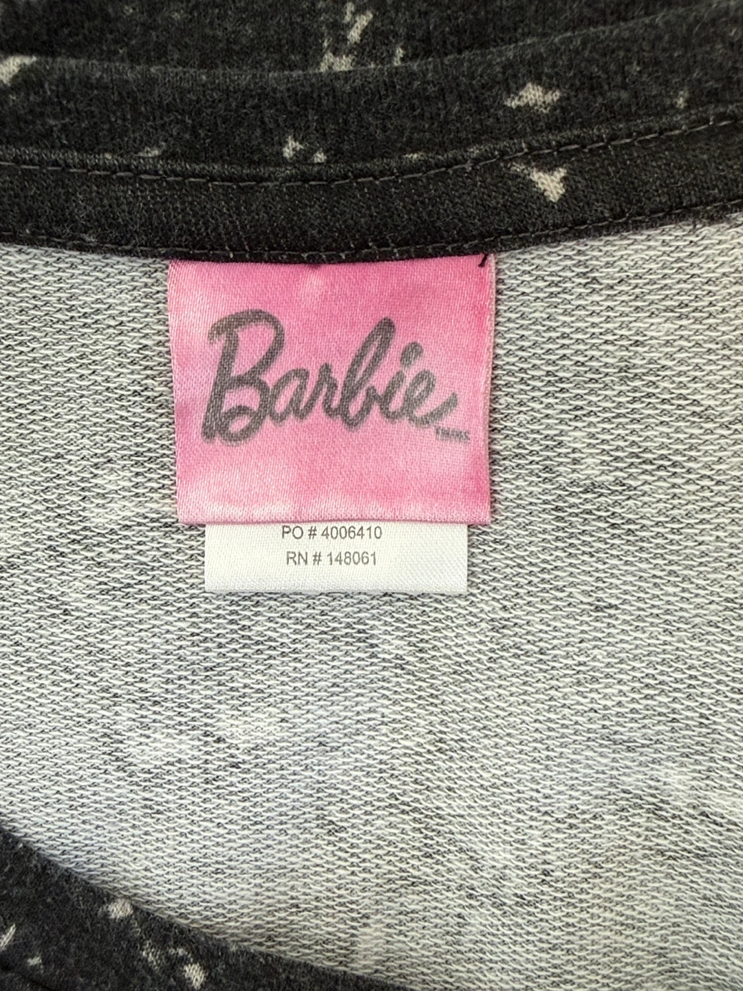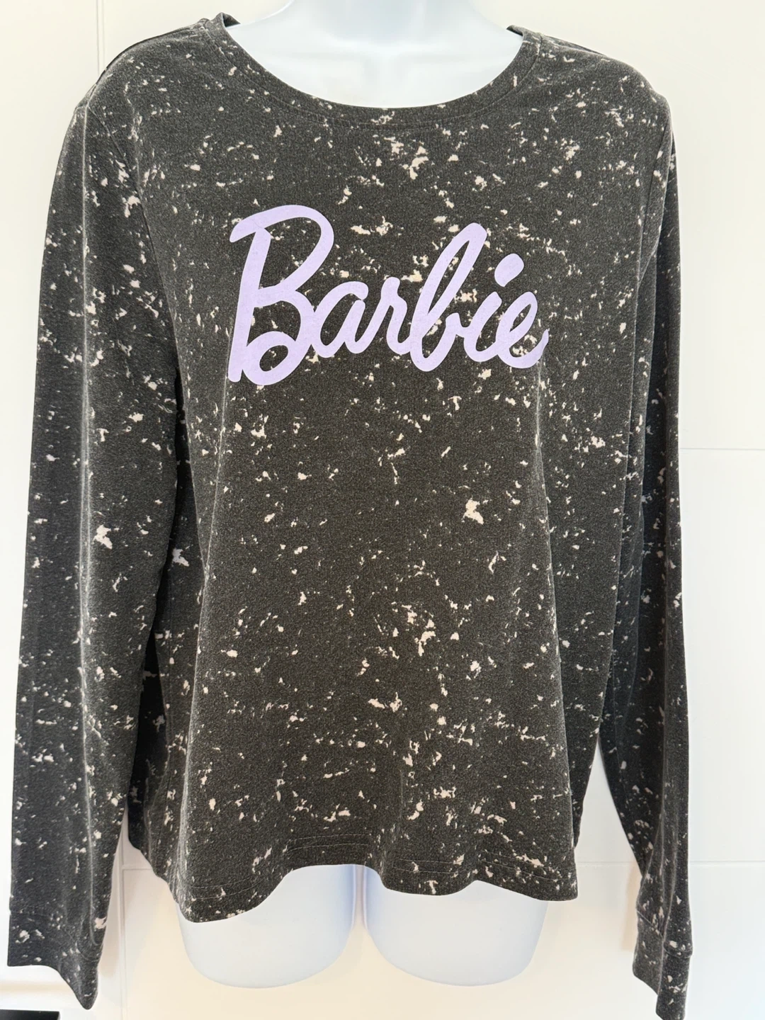 crew neck sweatshirt with long sleeves. Black and white marble with light purple “Barbie” print on the front.