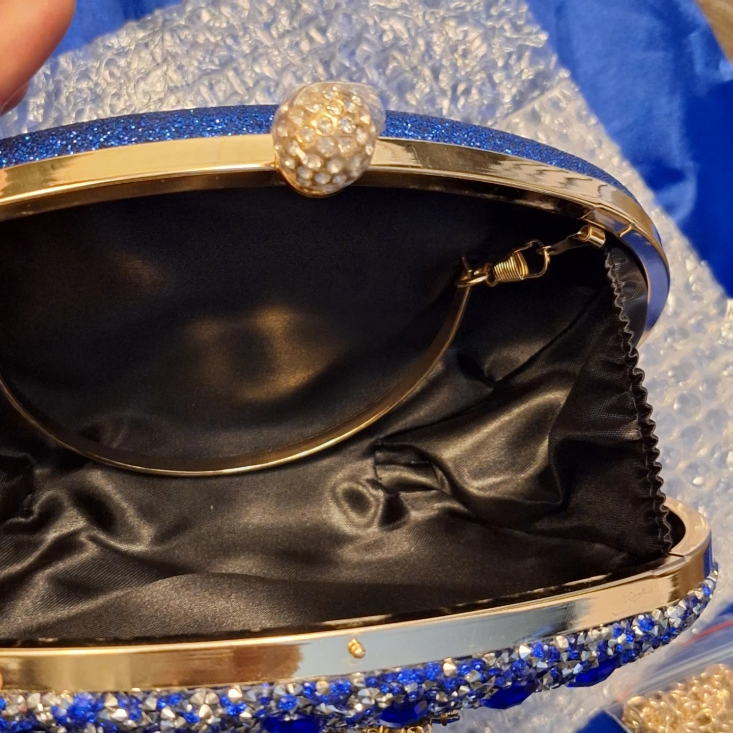This stunning blue clutch is covered in dazzling rhinestones and beads with a floral design. It has a secure clasp and a detachable gold chain strap for versatility. Includes a protective dust bag VERANO HILL