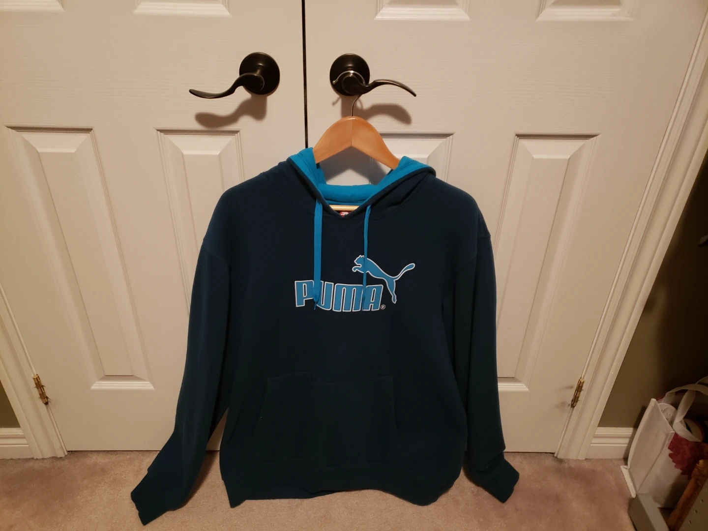 This is a Puma hoodie. It's a dark teal colour with a contrasting bright blue hood lining and drawstrings. It features the classic Puma logo on the chest. It has a front pouch pocket. Hoodie is in Excellent condition only worn a few times!