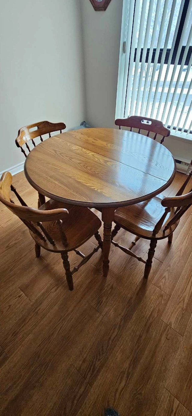 This is a used, solid wood kitchen table with four chairs, perfect for a small to medium-sized dining area. The table has two extendable leaves, allowing you to easily accommodate extra guests for family dinners or social gatherings. While it has some wear and tear, it's structurally sound and ready for a new home. Table dimensions: Oval 40" x 62" with 2 leaves (each 11"). Material: Solid wood. Includes: Table and four matching chairs. Condition: Used, with some surface scratches and wear. Cash accepted.