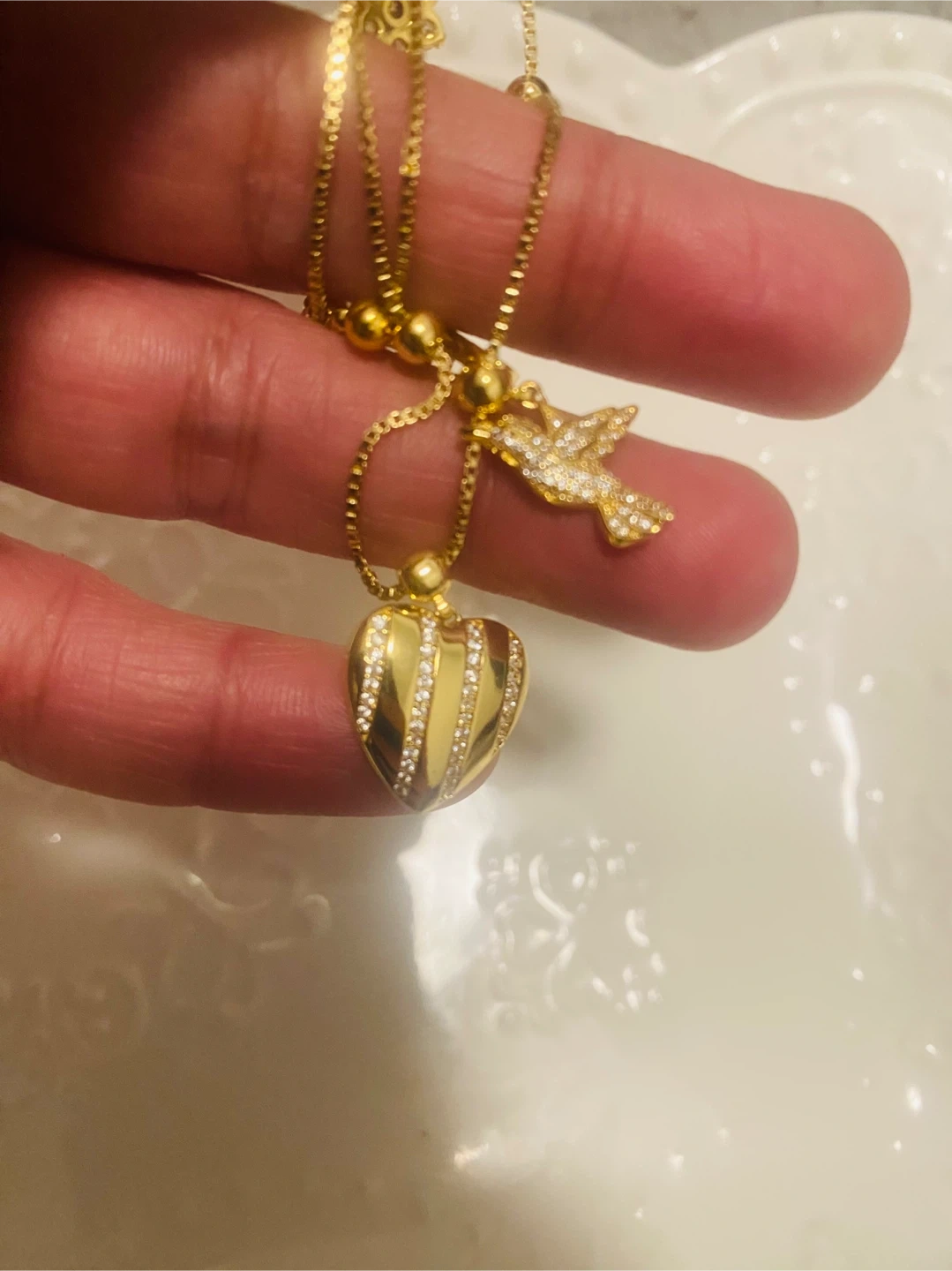 This gold-tone necklace features a delicate chain with multiple charms including a heart, a bird, and floral designs, some accented with rhinestones. It's adjustable for a comfortable fit. This piece adds a touch of sparkle to any outfit!