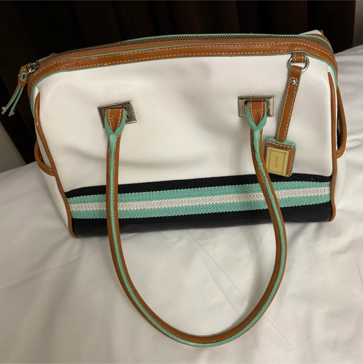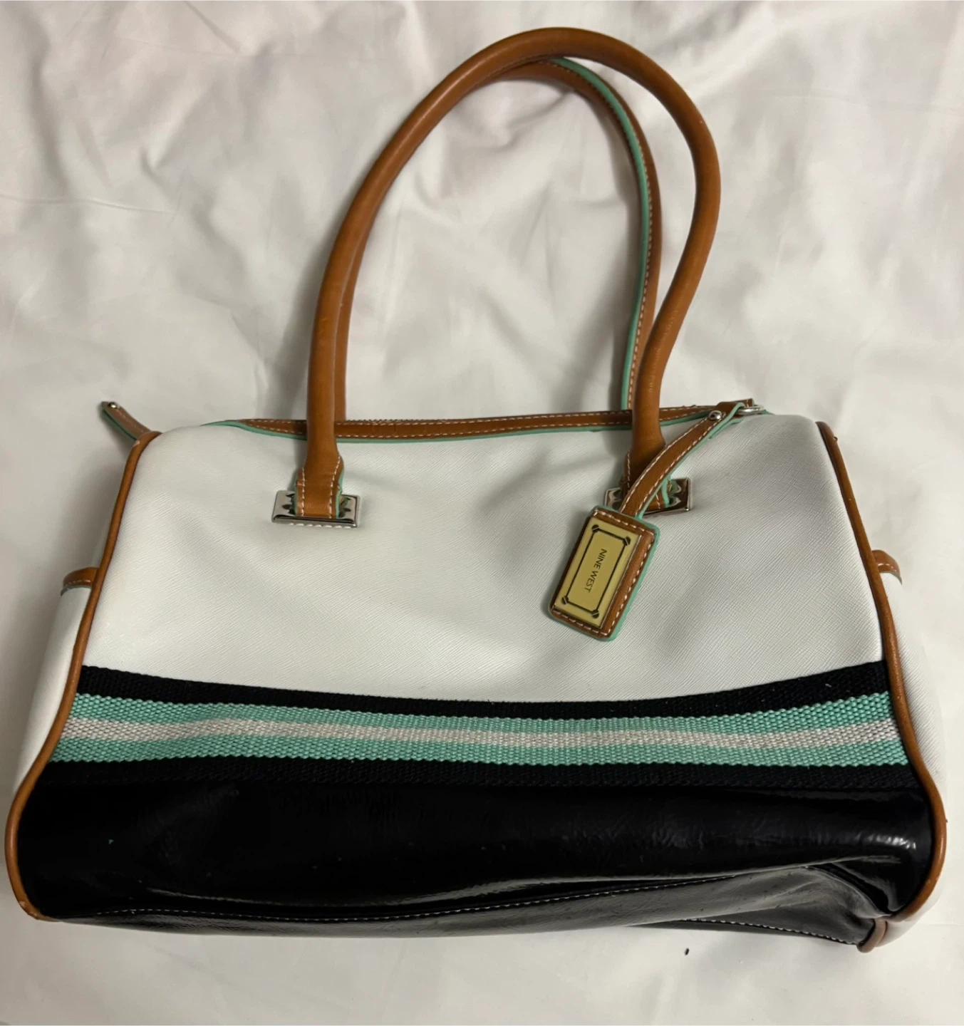 This Nine West satchel handbag is white with brown leather handles and trim. It features a black patent leather base and a stylish stripe pattern with mint green accents. Zip closure. Interior pockets for organization.