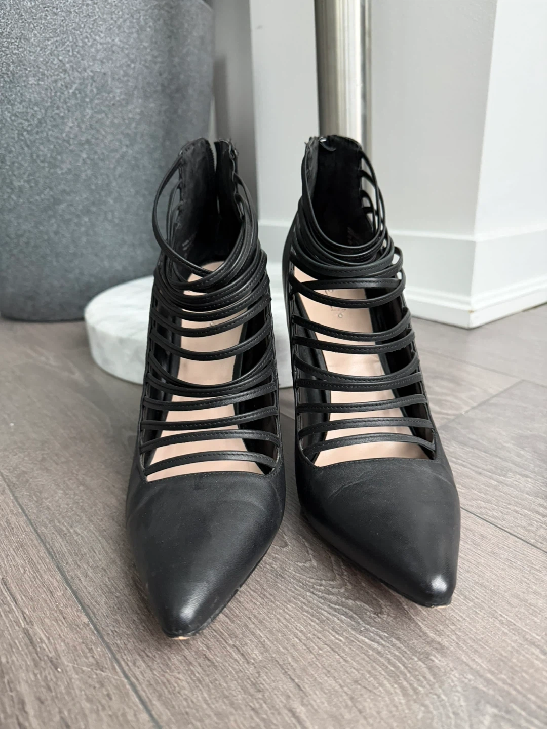 These black strappy heels feature a zip-up back. They're made of leather and have a pointed toe. These heels are perfect for adding a touch of flair to any outfit!