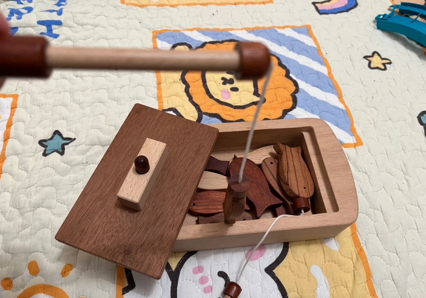 This wooden fishing game features a box with a lid and multiple wooden fish pieces. It includes a fishing rod with a string and magnetic attachment. It's a fun toy for developing fine motor skills. Great for toddlers and young children!
