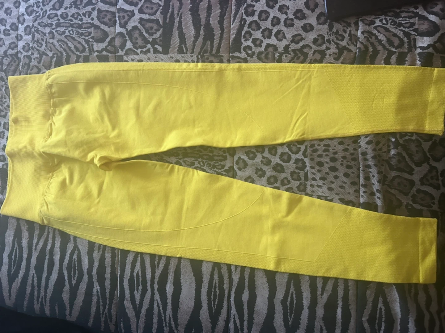 These bright yellow seamless leggings are designed for comfort and support. They feature a high-waisted fit with a textured waistband and bum-sculpting detail. Made from a stretchy, breathable fabric.