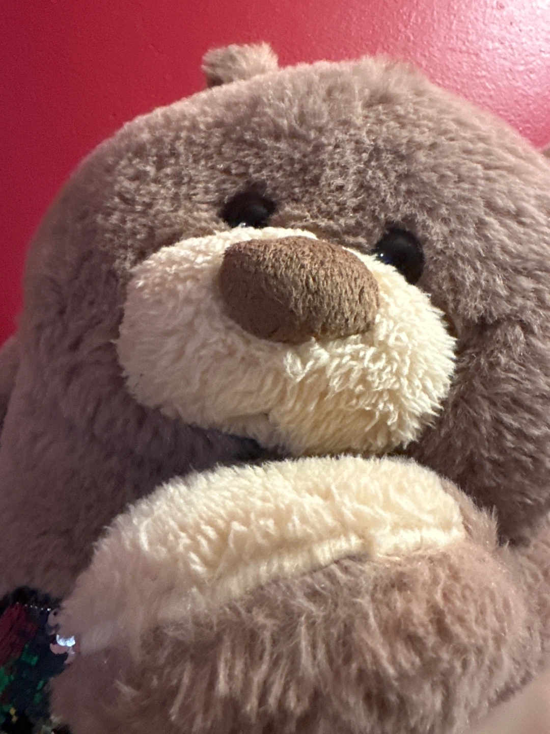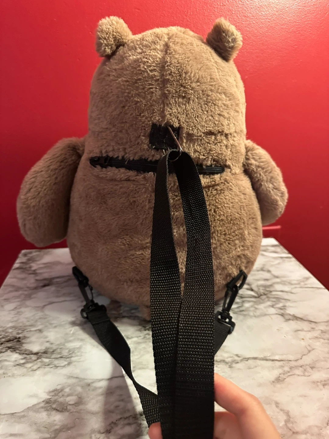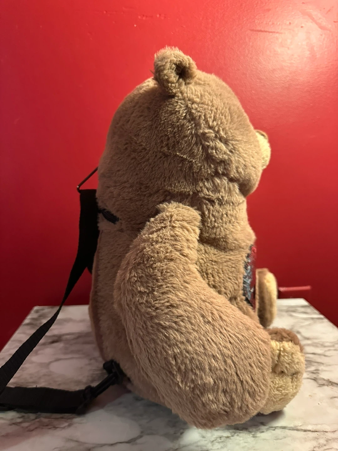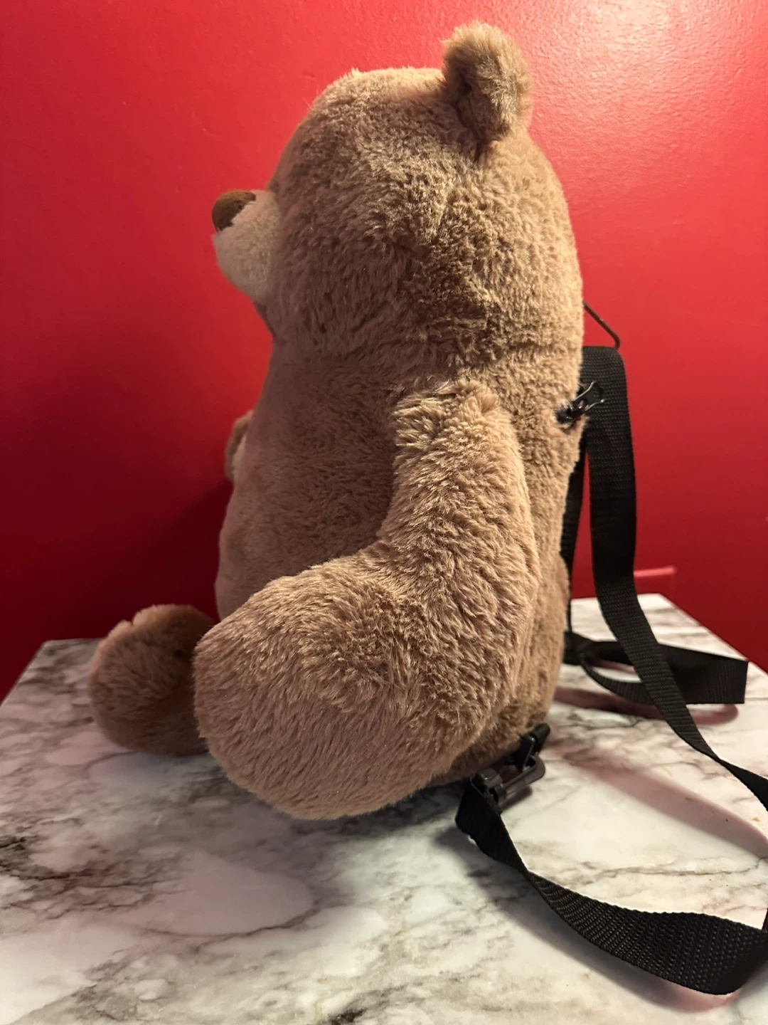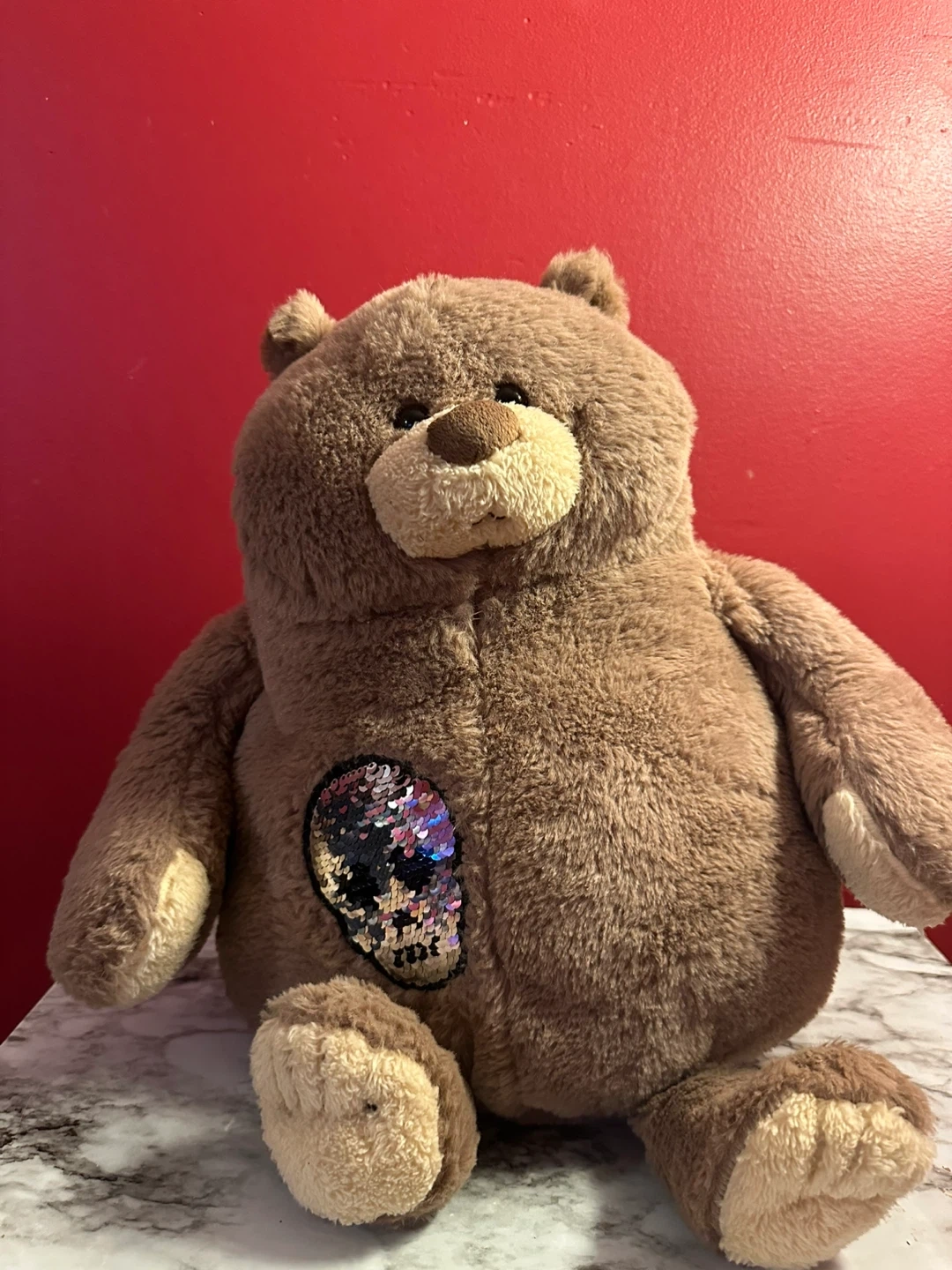 This is a brown teddy bear shaped backpack. It has a zipper closure on the back for storage and adjustable straps. There's a sequined skull patch on the front. I loved this bag but I think it’s time to sell it maybe someone else would love it!!