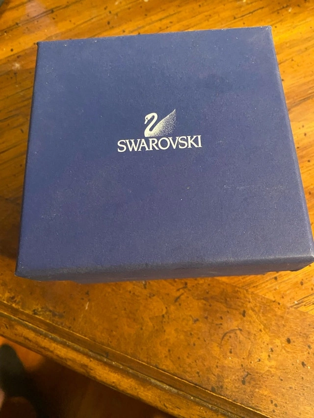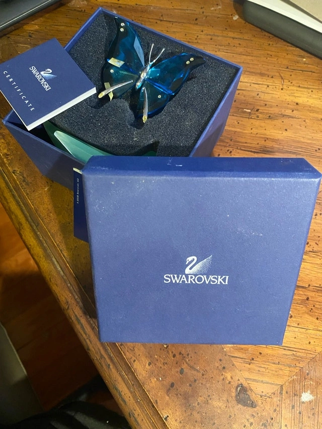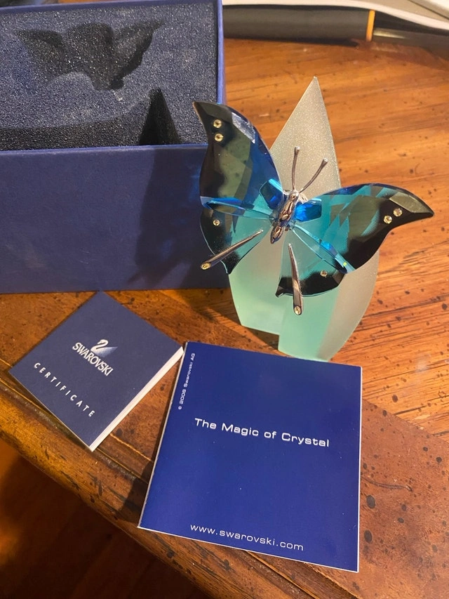 This is a Swarovski Crystal Paradise Ambur Butterfly in blue turquoise crystal. Designed by Roland Schuster, it was introduced in 2003 and retired in 2007 as part of the "Exotic Butterflies" collection. The piece has the code number 622735 and comes with a magnet and a stand. This lovely blue crystal butterfly figurine is perched on a frosted leaf stand and is in excellent, like-new condition. It beautifully captures the light and adds a touch of elegance to any space. Cashless payment and cash are accepted.