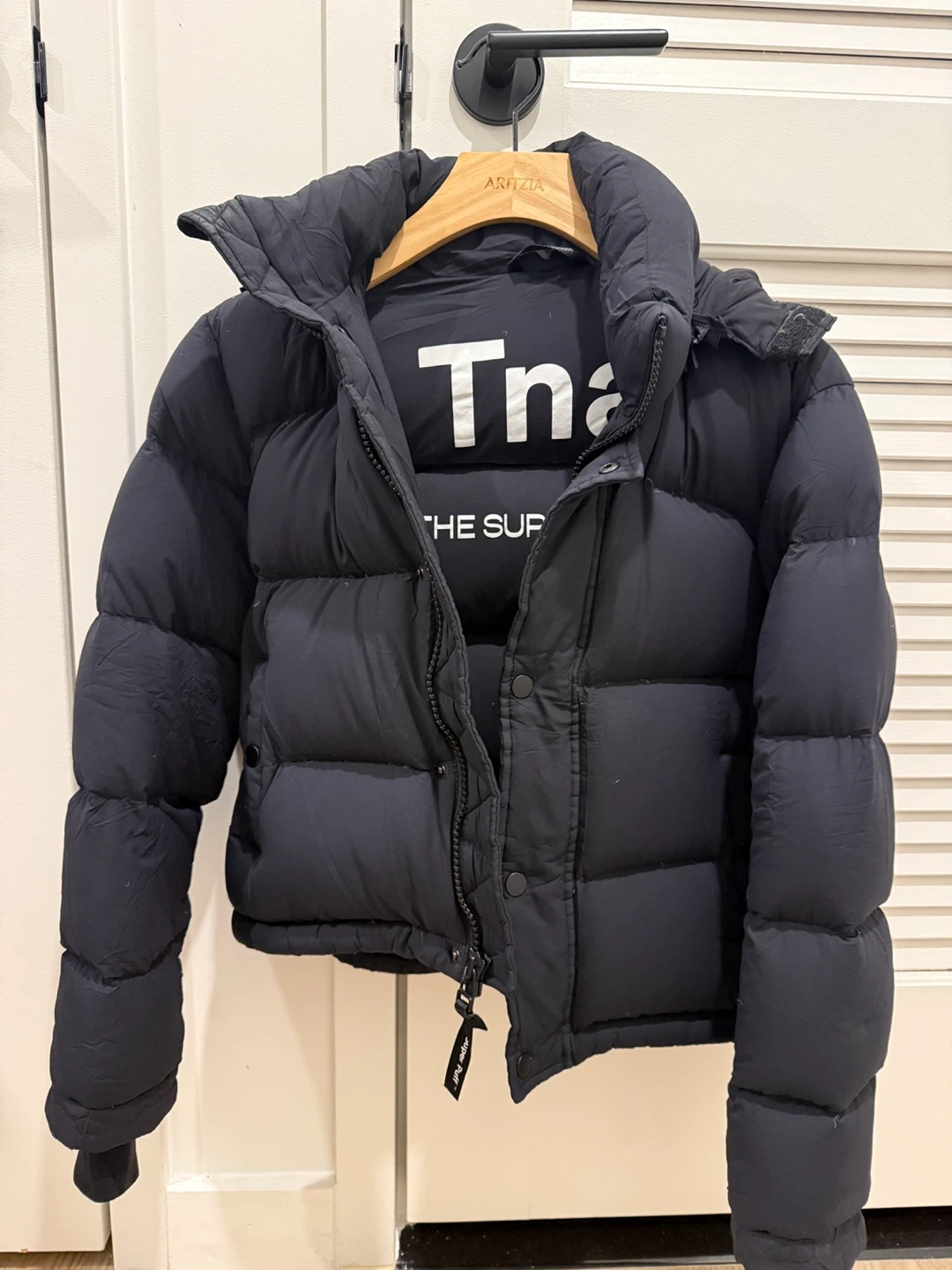 This is a Tna The Super Puff puffer jacket. It's a black, cropped puffer jacket. It's insulated for warmth and has a full zip closure.