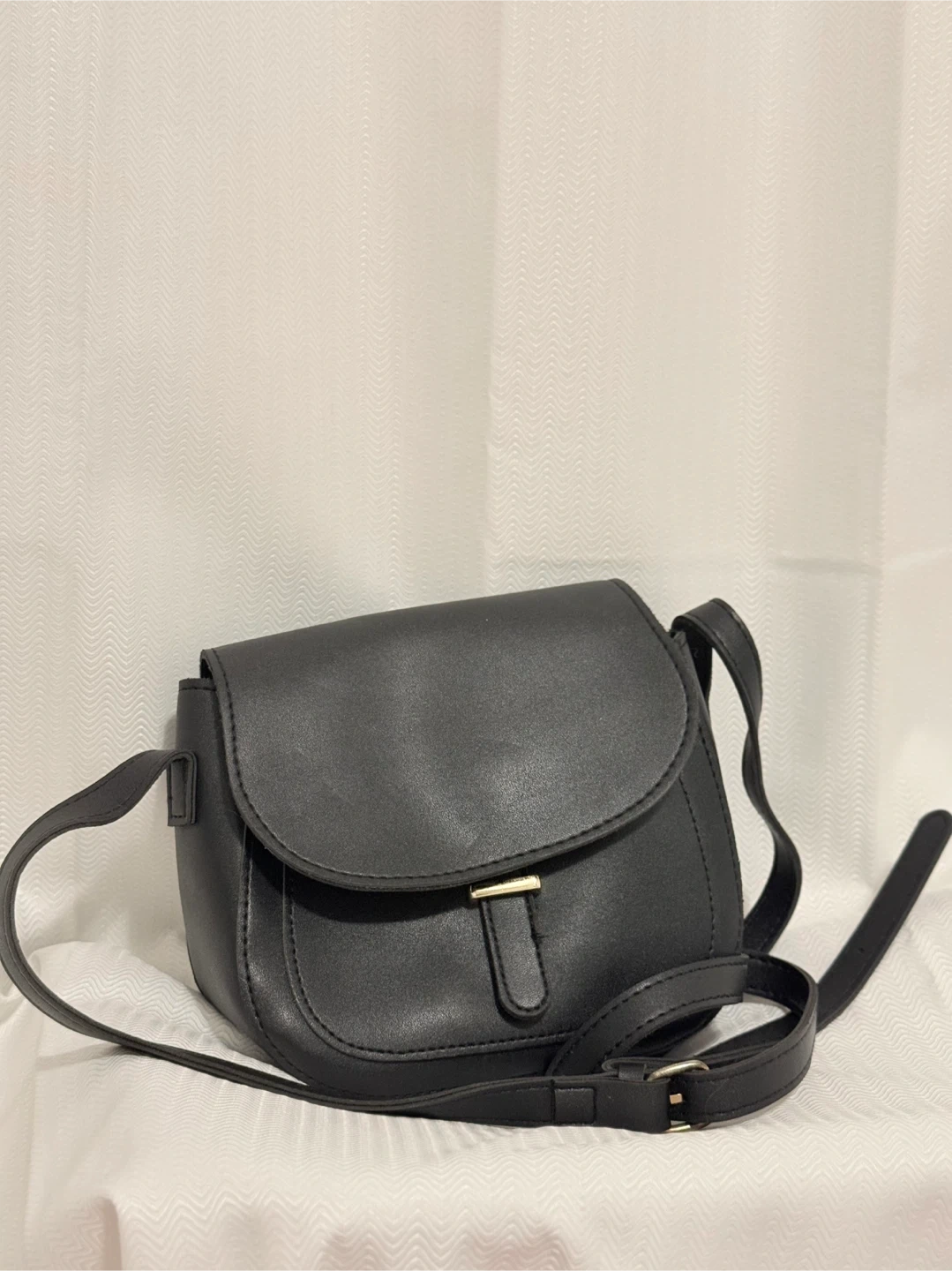 A stylish black crossbody purse. It's made from faux leather and features a clasp closure. The adjustable strap makes it comfortable to wear.
