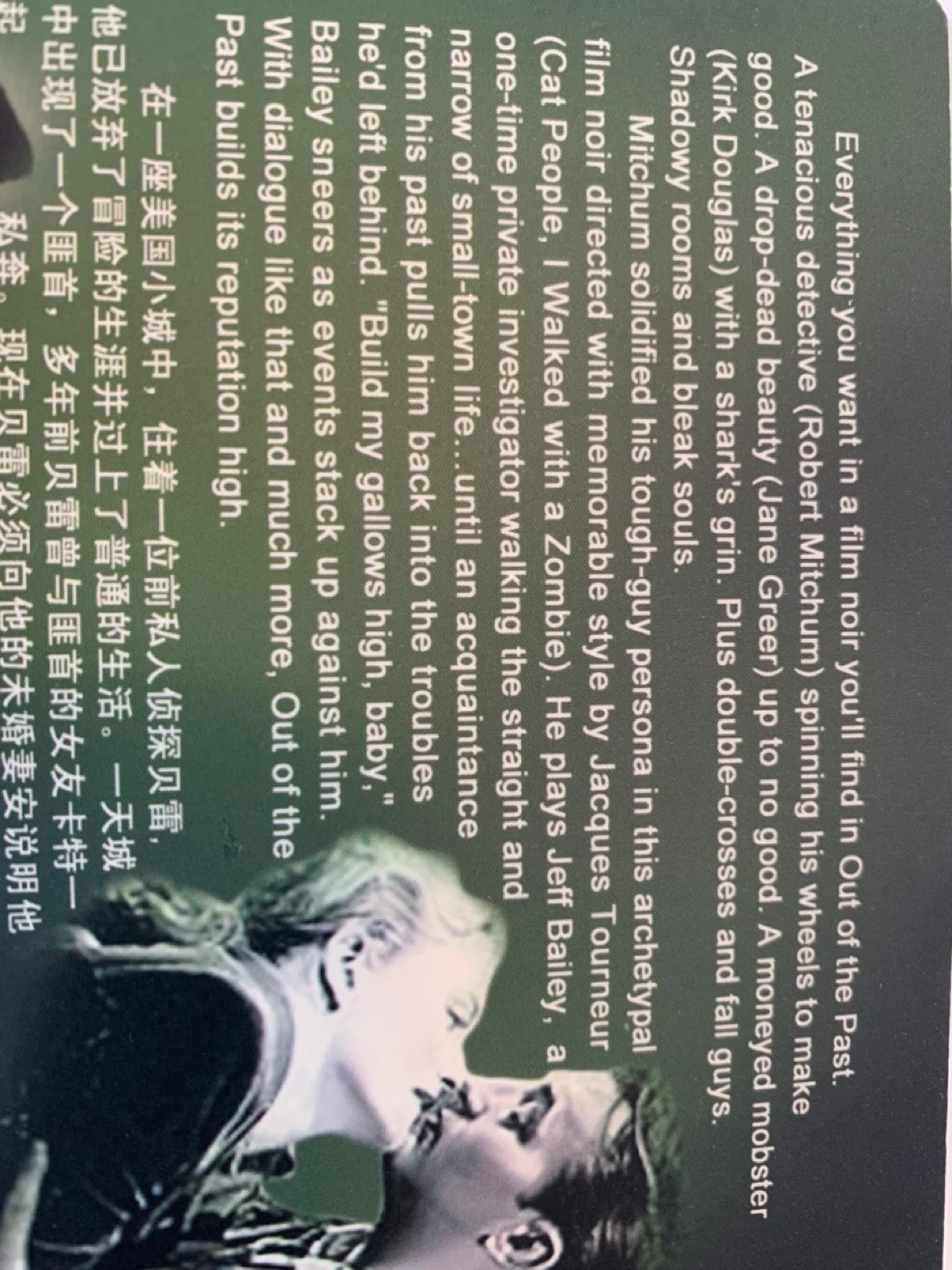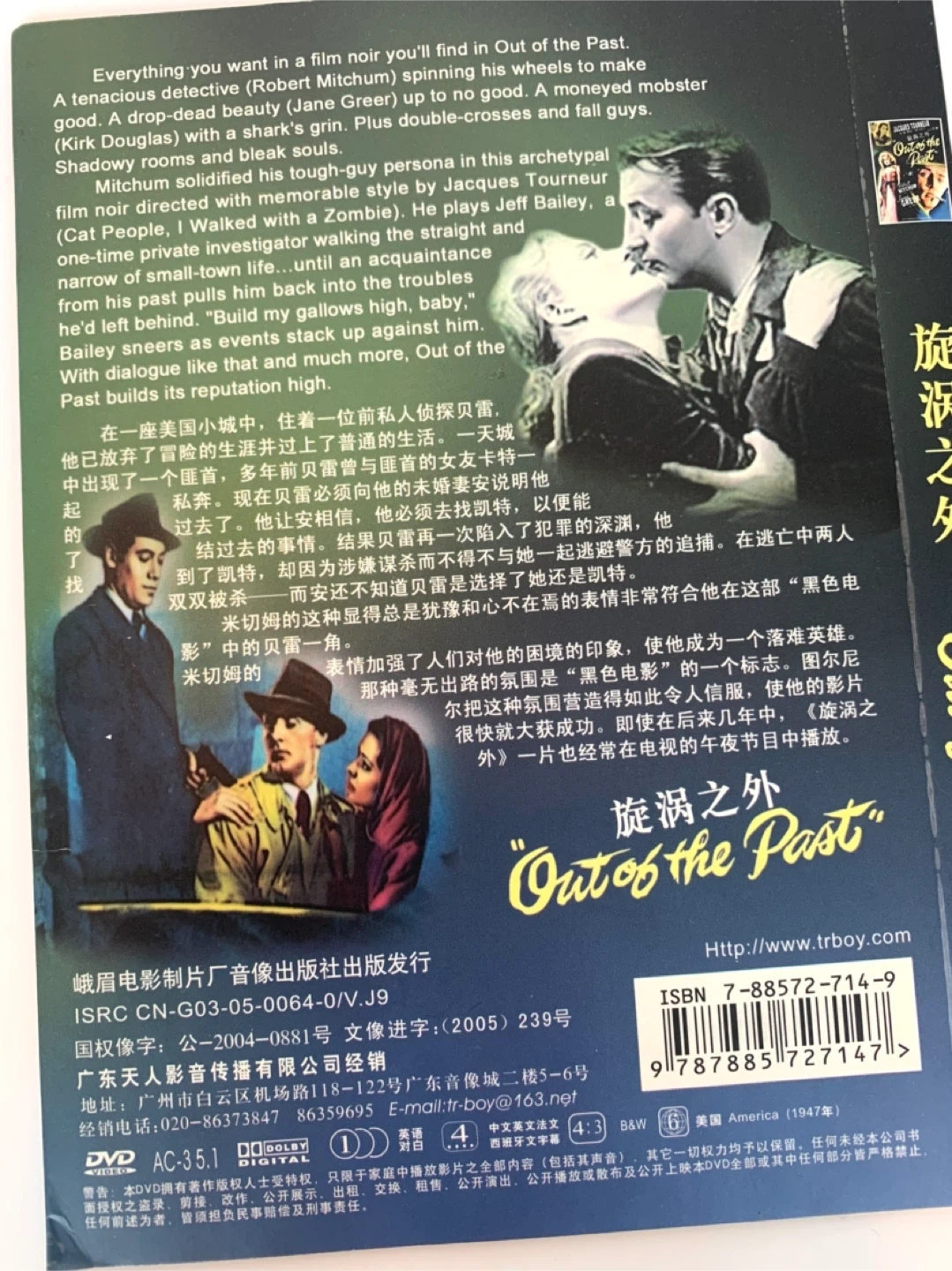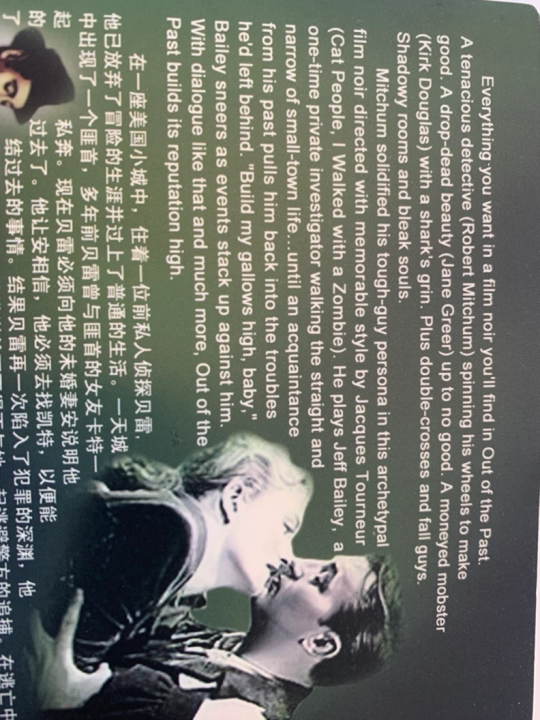 This is the DVD for the film "Out of the Past", starring Robert Mitchum and Jane Greer. The film was directed by Jacques Tourneur. It's a classic film noir with a compelling story and memorable performances. Disc is in good condition.