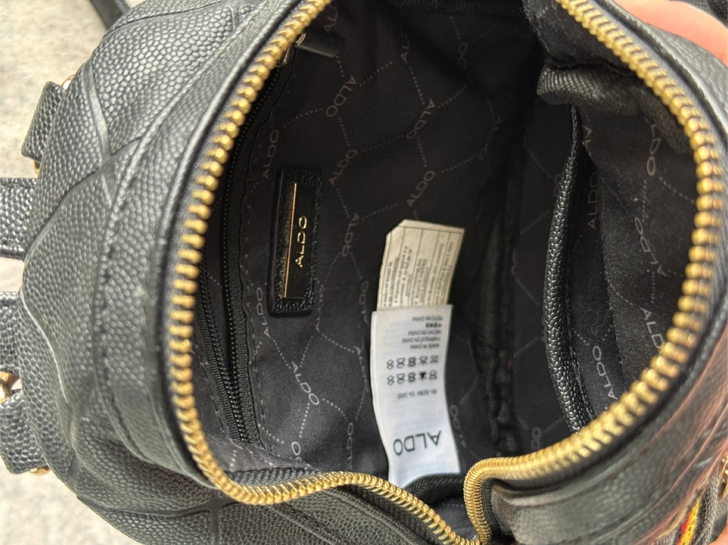 This black mini backpack from ALDO features fun travel-themed patches. It has a red pom-pom charm and a gold-toned bear charm. The faux leather material offers a stylish look.