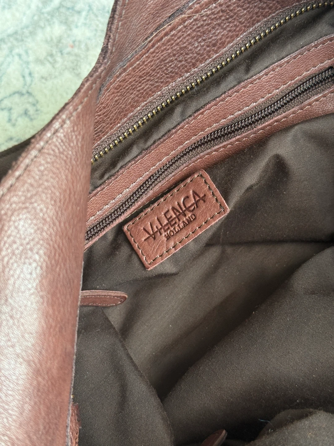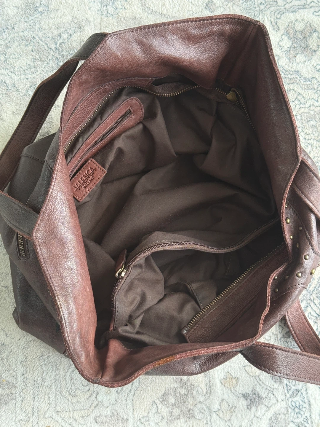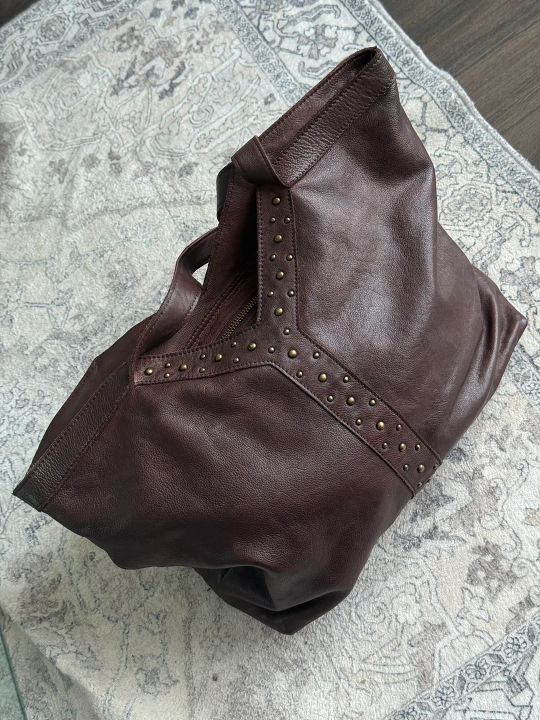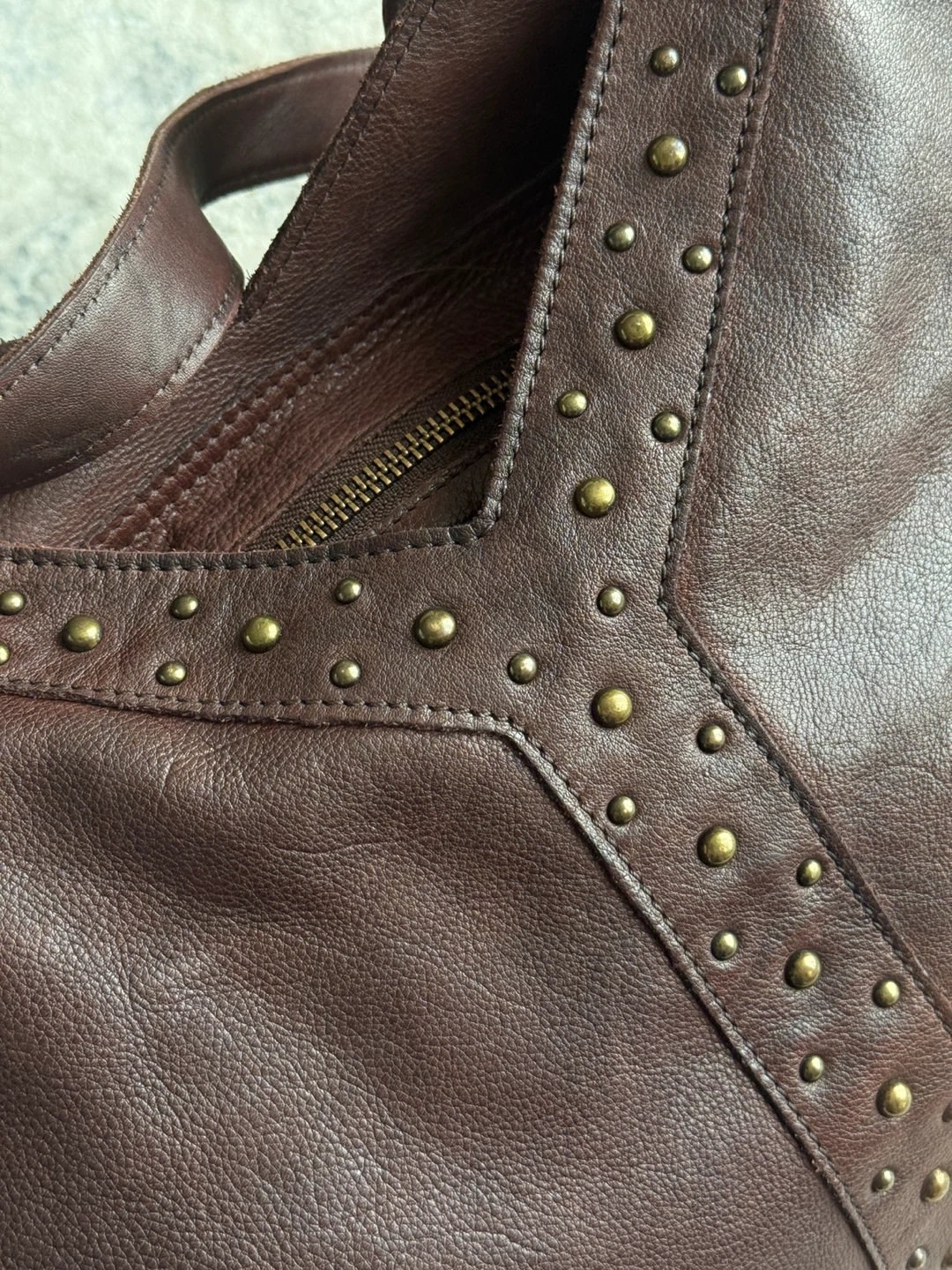 This is a stylish brown leather tote bag. It features decorative brass-tone studs along the front panel. The interior has a zippered pocket and a main zippered closure. Leather material.
