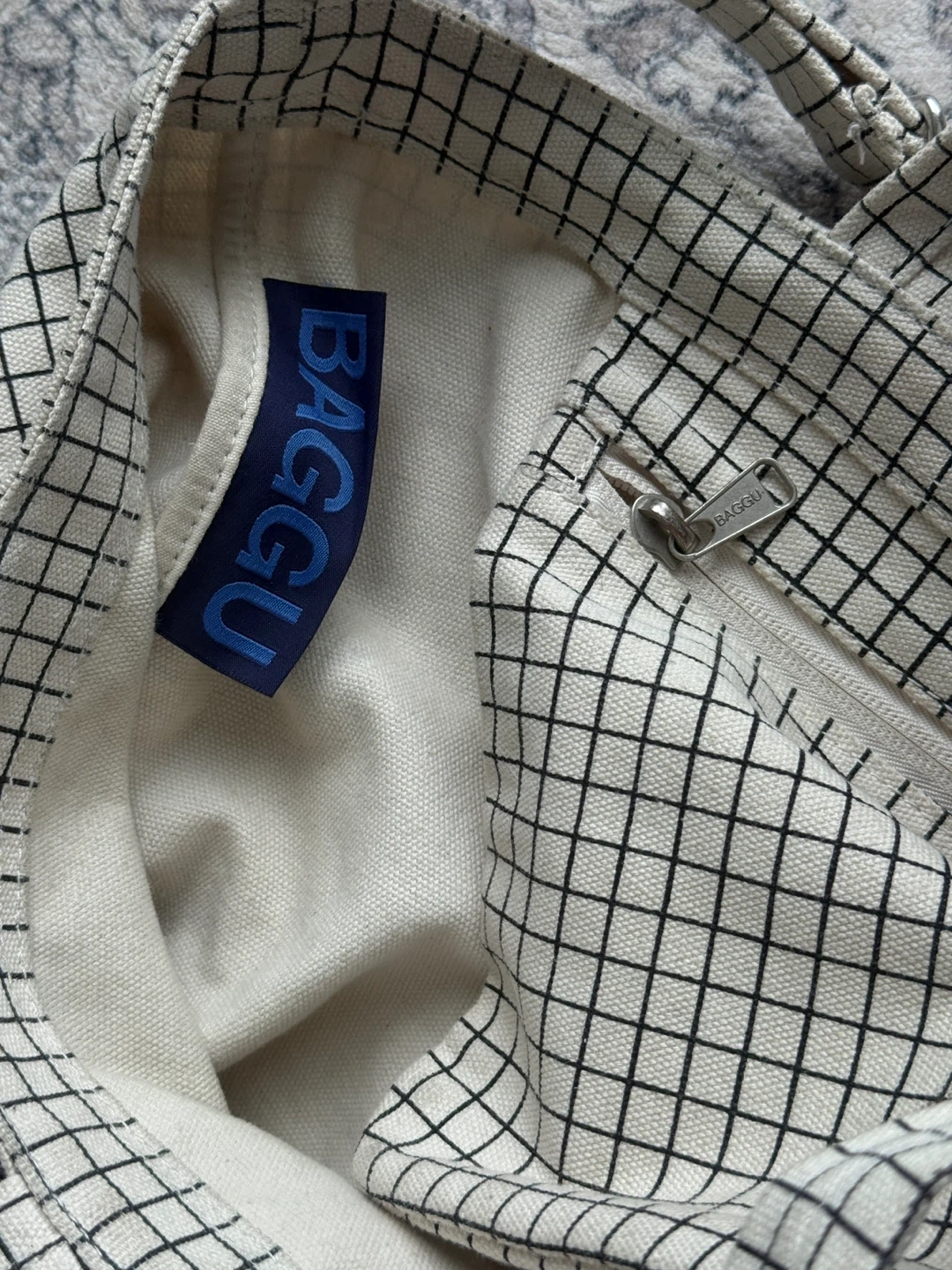 This BAGGU tote bag is made from durable canvas with a classic black and white grid pattern. It features dual top handles and a detachable crossbody strap for versatile carrying. The main compartment is secured with a zip closure. It's a practical bag for everyday use!