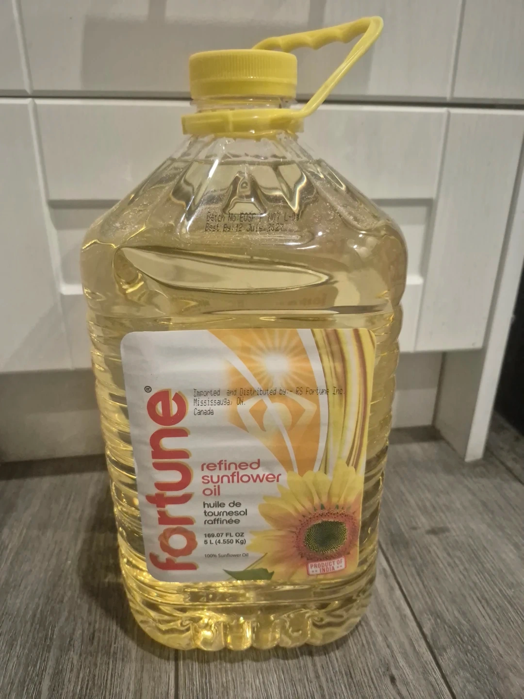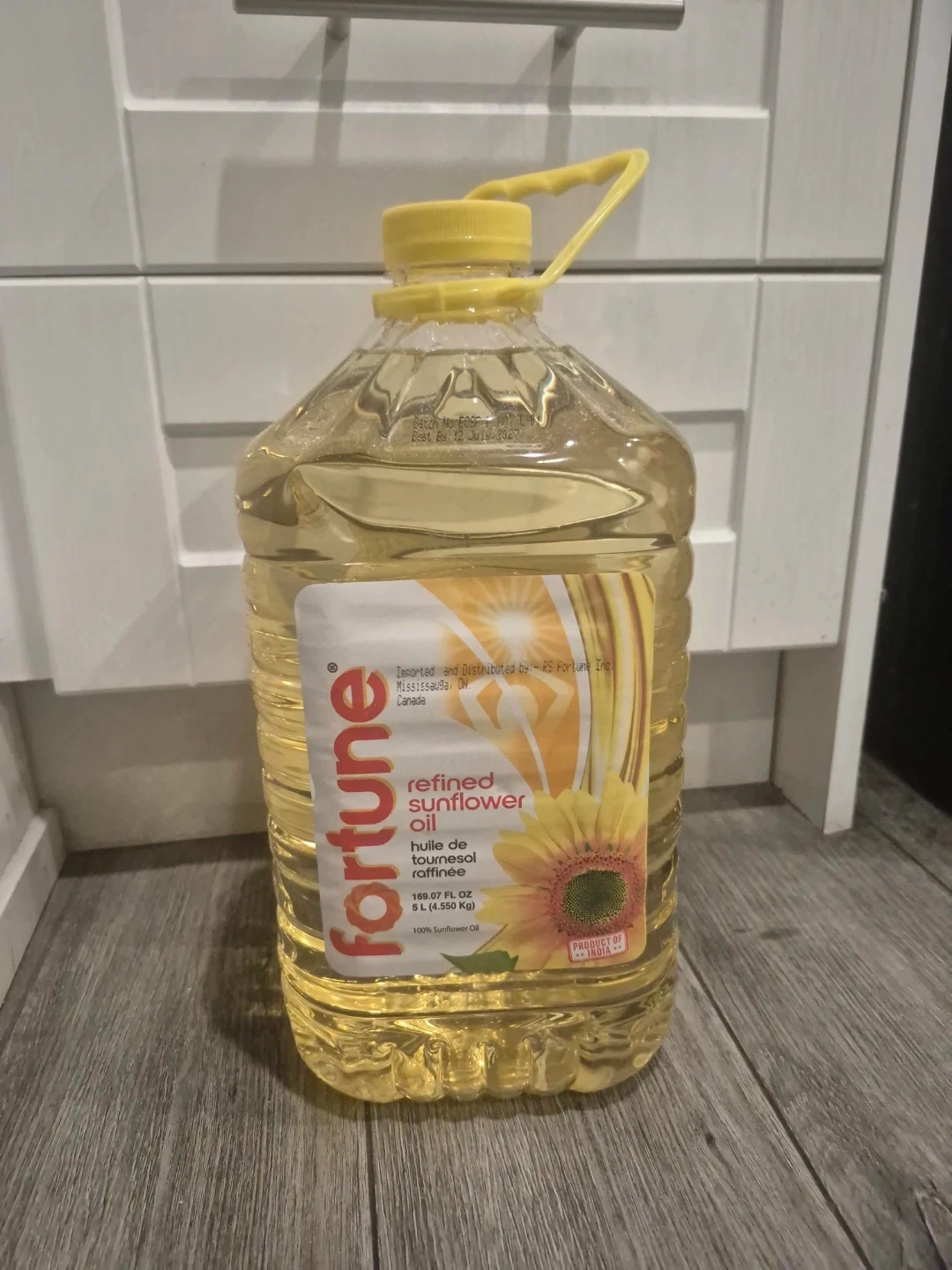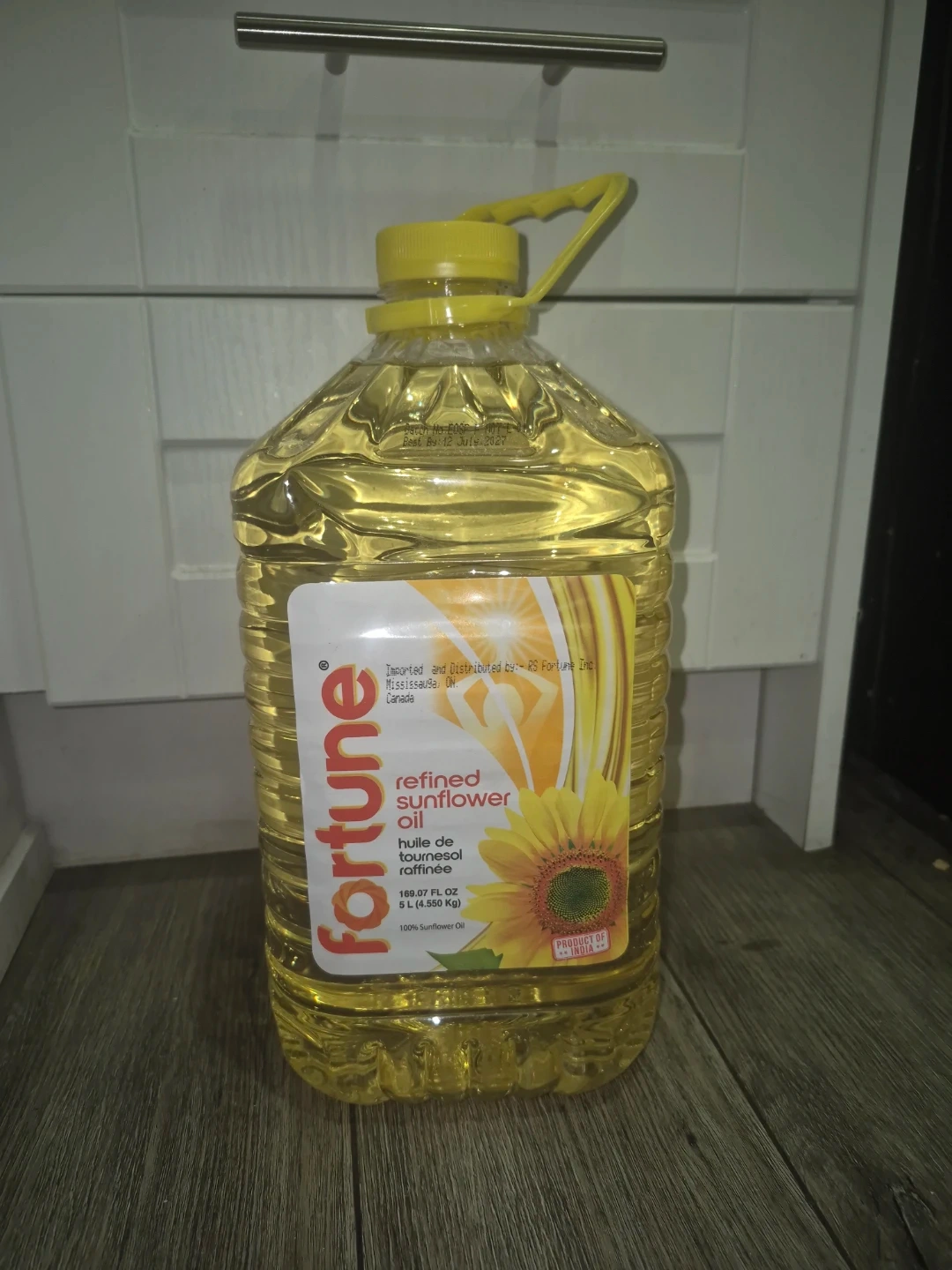 Fortune refined sunflower oil comes in a 5 L bottle. It's made with 100% sunflower oil. This is a great staple for any kitchen! Never used.