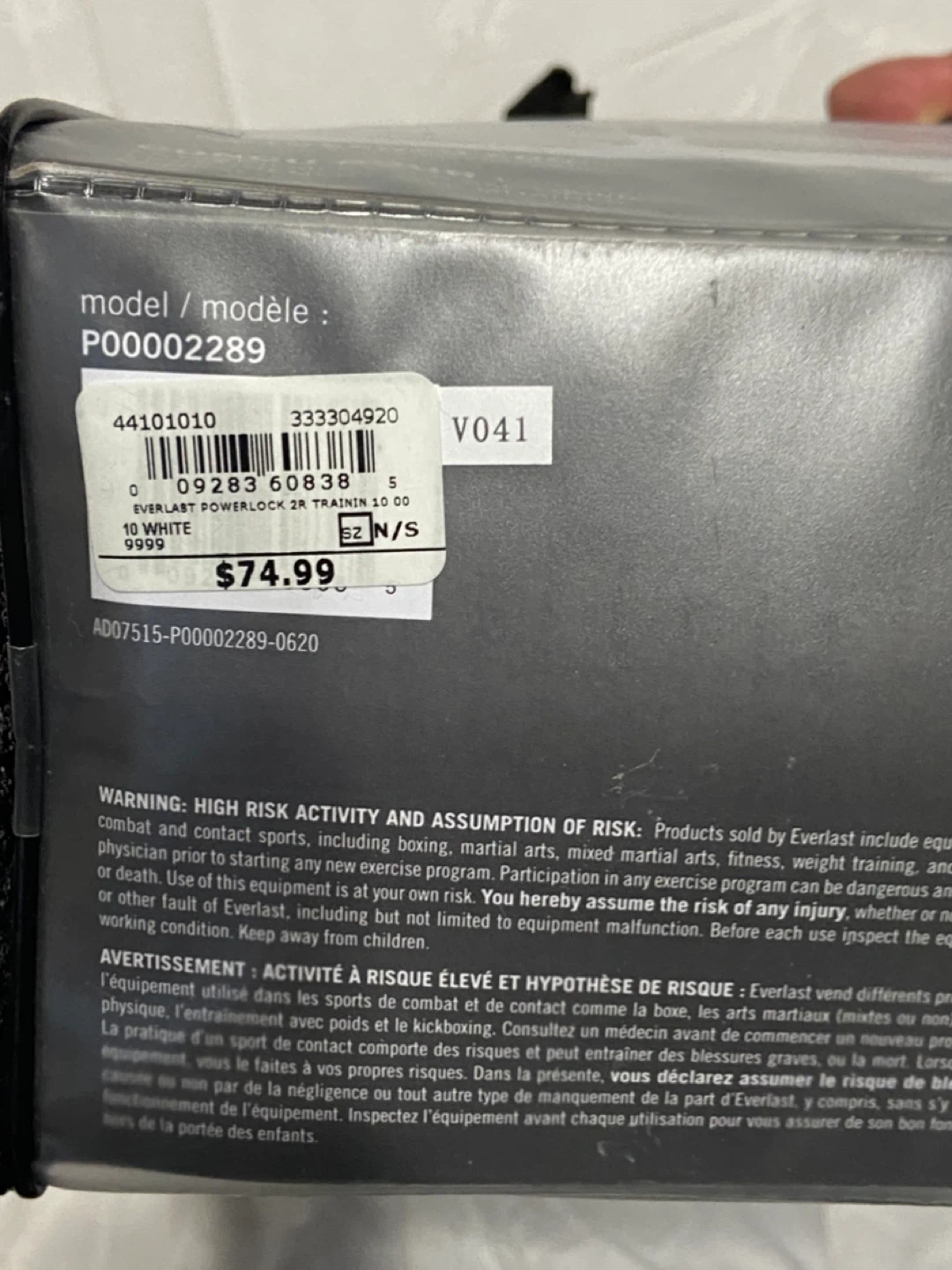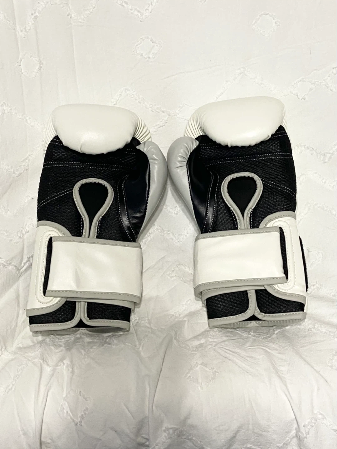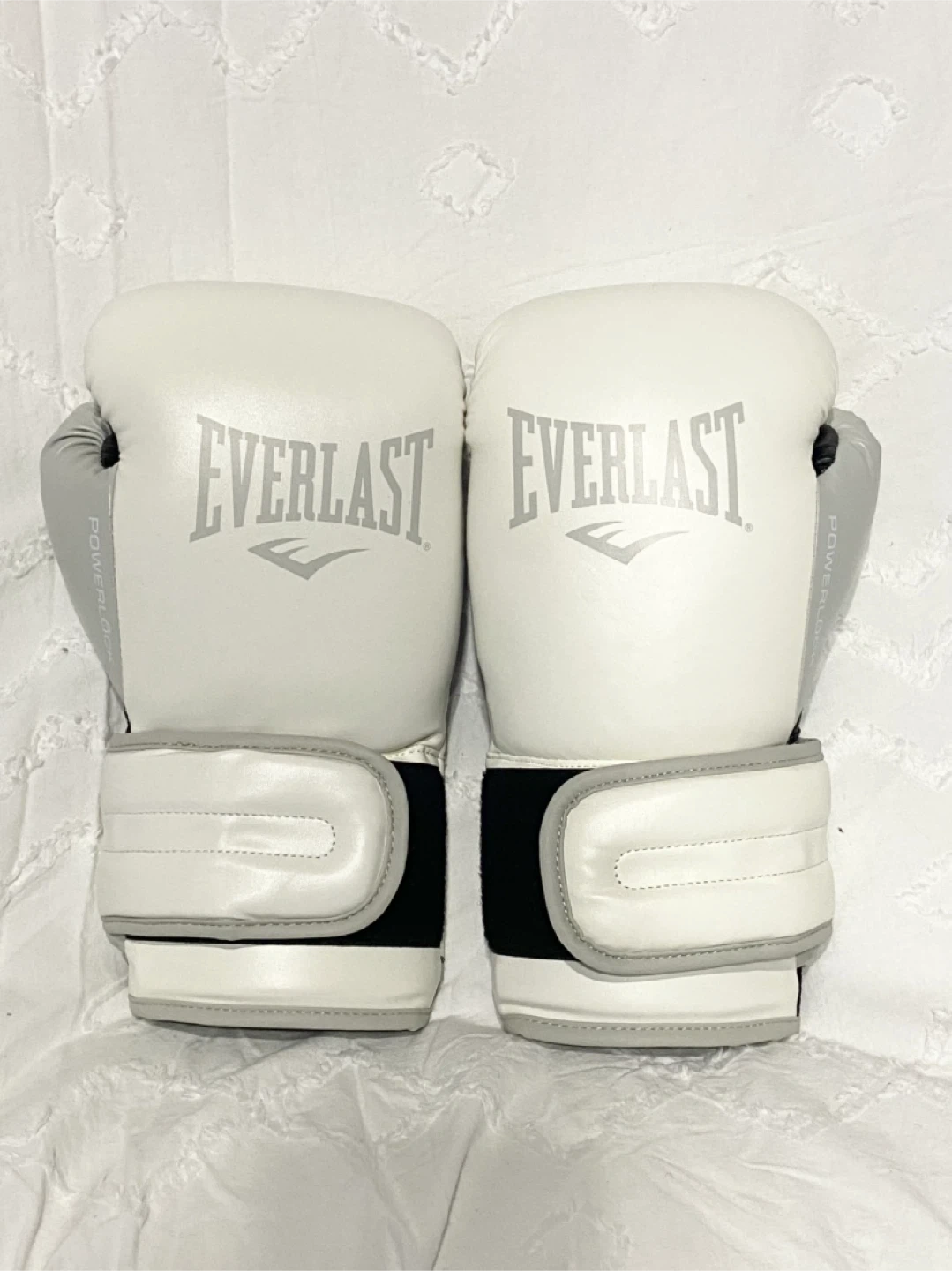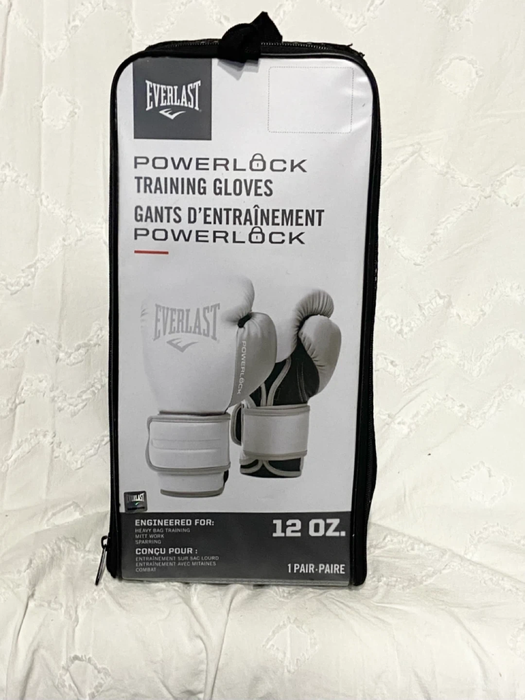 These are Everlast Powerlock training gloves in white. They are 12 oz and engineered for heavy bag training and sparring. The gloves feature adjustable hook-and-loop closures for a secure fit.