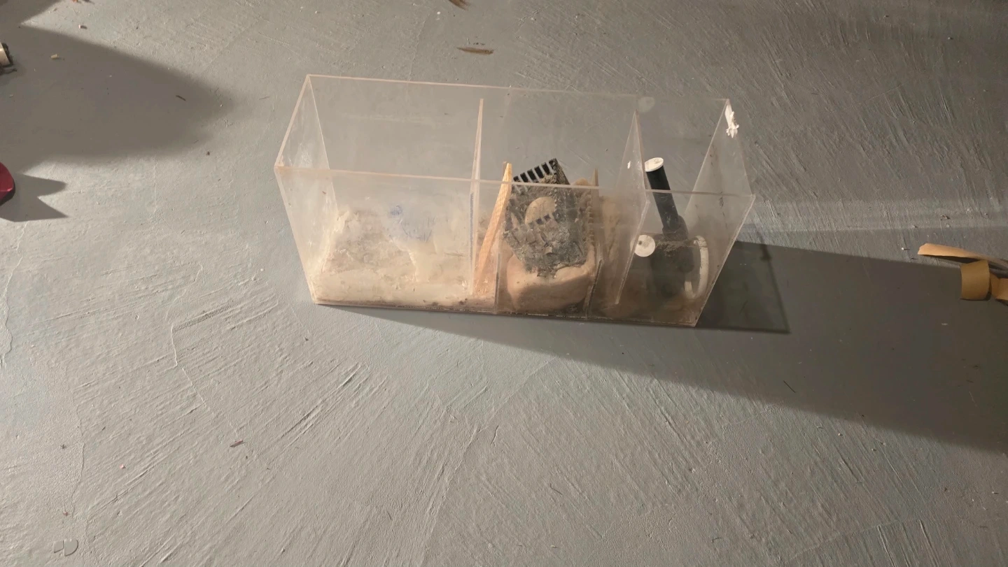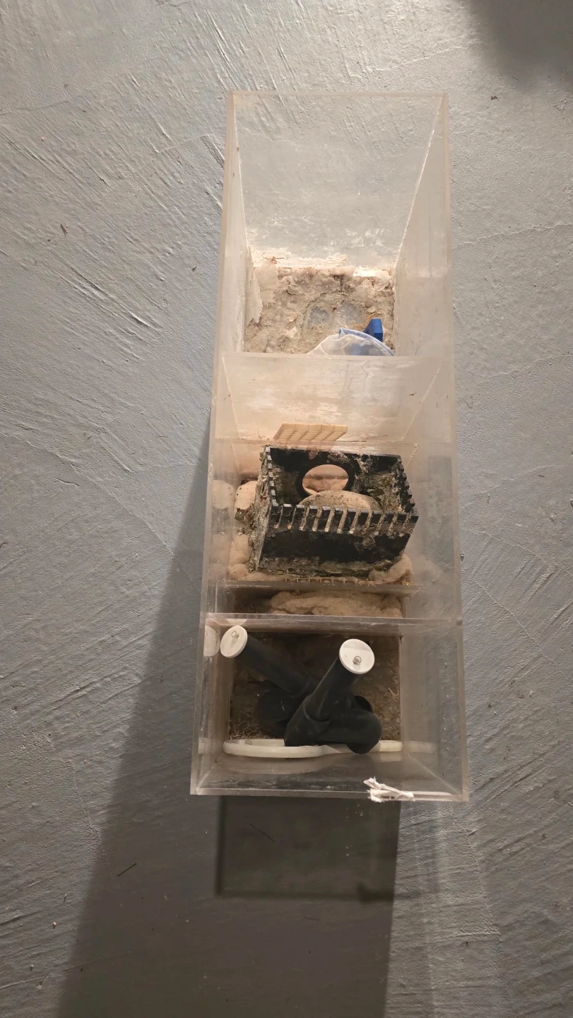 Three-compartment clear acrylic filter box for aquariums. It's designed to hold filter media. This box would be useful for organizing and maintaining water quality in your fish tank.