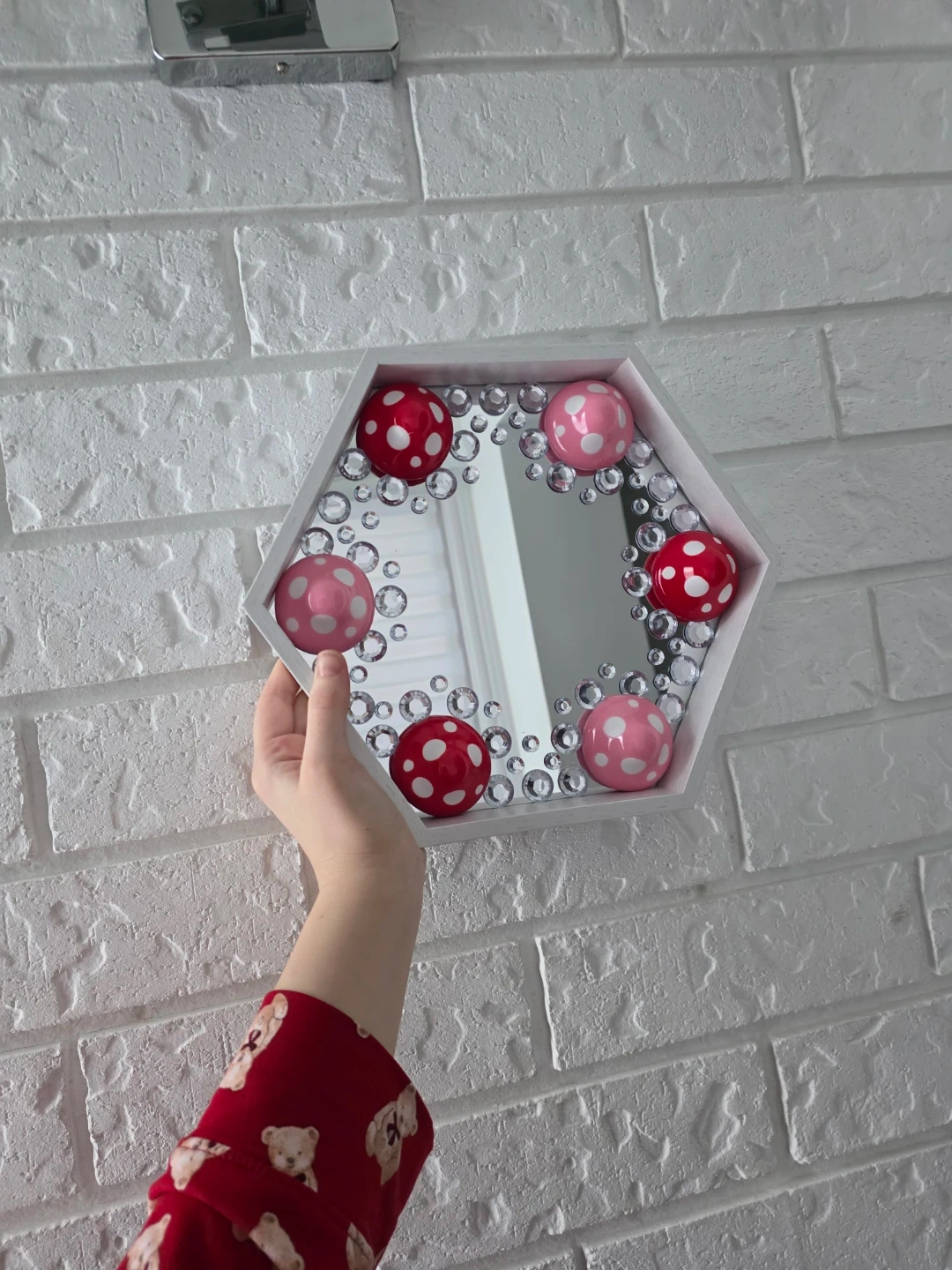 Handmade mushroom accents, sparkles, and bold shapes come together to form a mirror that doesn’t try to blend in. It’s meant to be noticed.