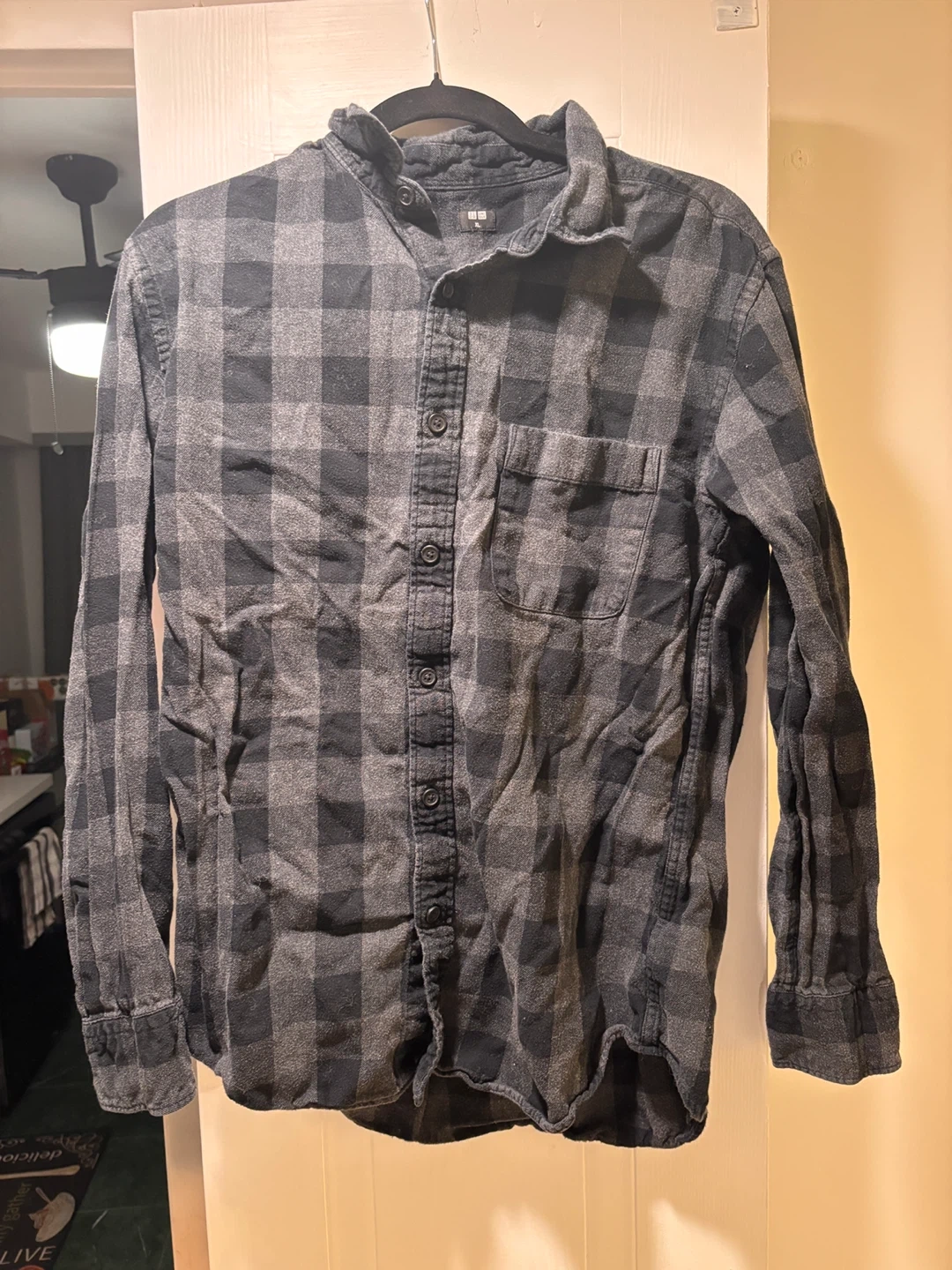 UNIQLO long-sleeved flannel shirt in grey and black plaid. Size XL. It's a classic button-up style with a chest pocket. This shirt's great for layering on cooler days!