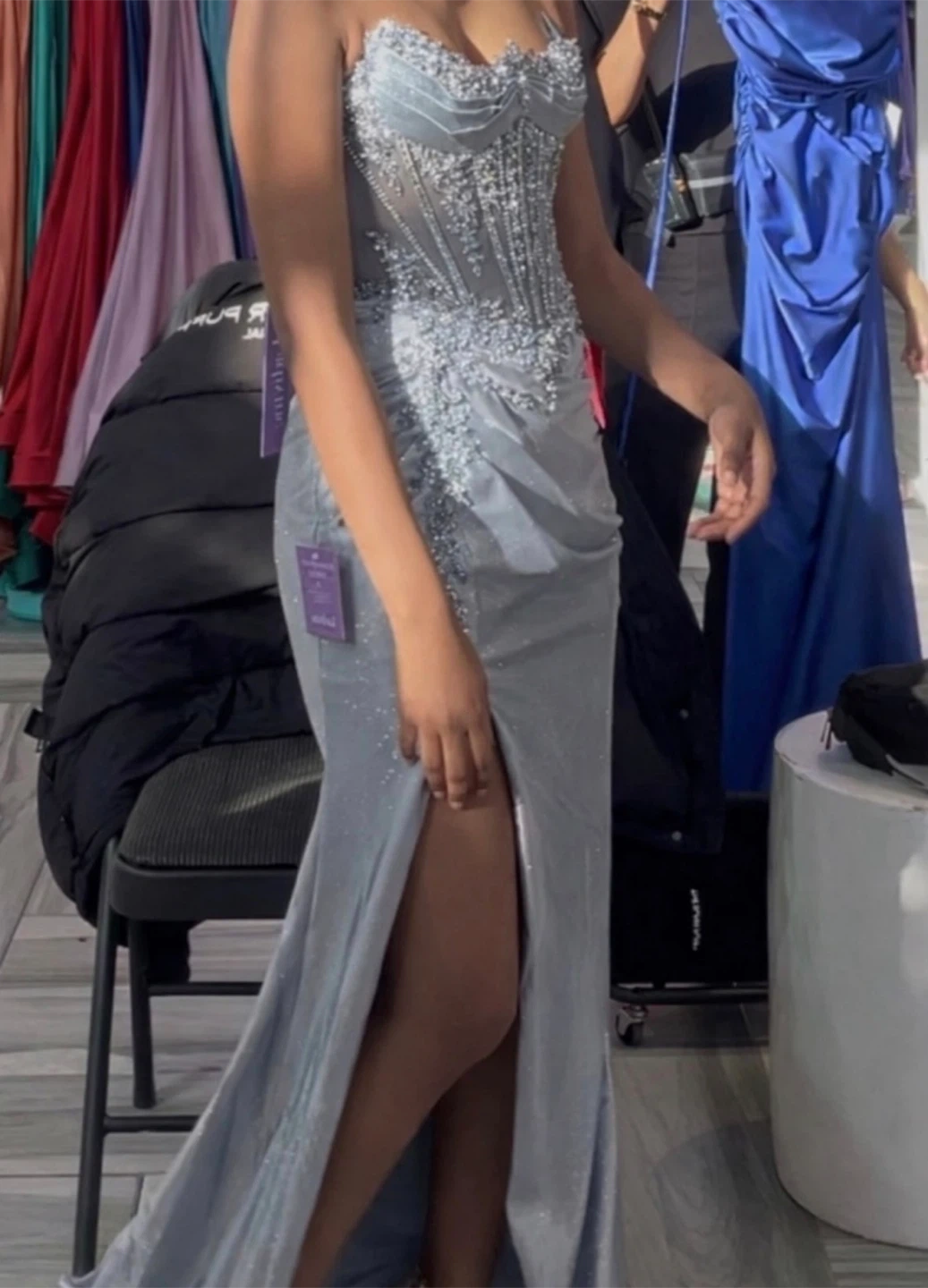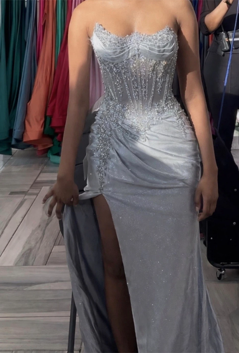 This stunning strapless gown features intricate beading and a shimmering silver fabric. It's designed with a flattering sweetheart neckline and a dramatic high slit, perfect for any formal event. The ruched detailing adds a touch of elegance to this glamorous piece.