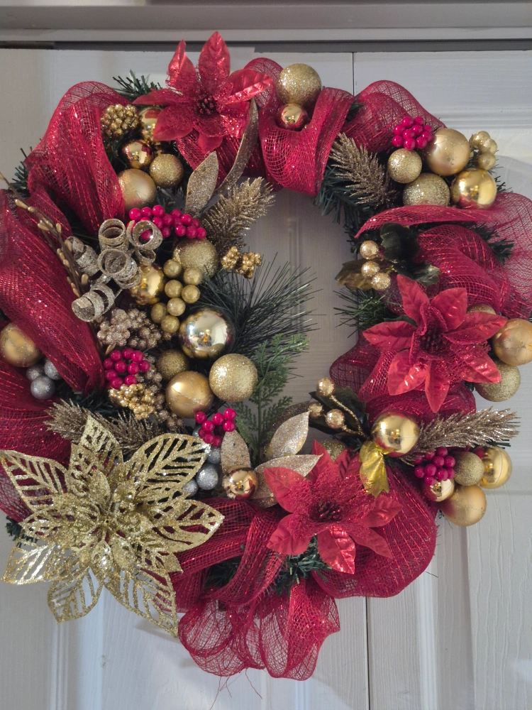Festive Christmas wreath featuring red poinsettias, gold ornaments, and glittery accents. Mesh ribbons in red add a lovely texture. It's decorated with faux pine sprigs and faux berries.