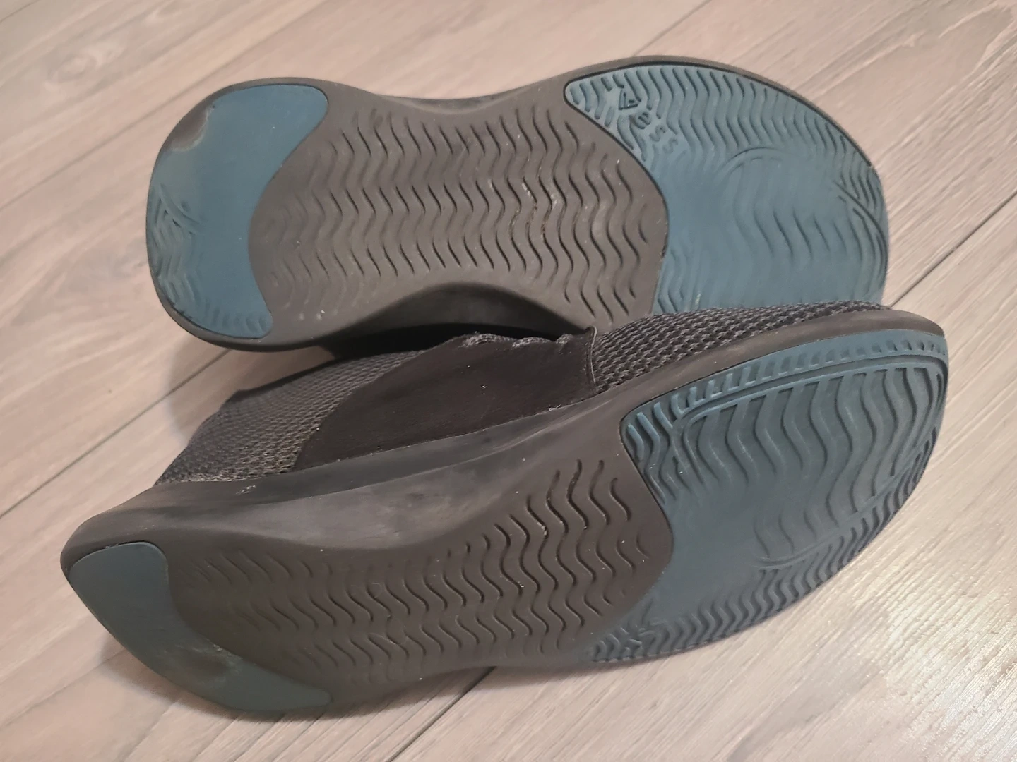 These Vessi running shoes are a size 8. They're black with blue accents on the soles. The uppers are made of a breathable mesh material.