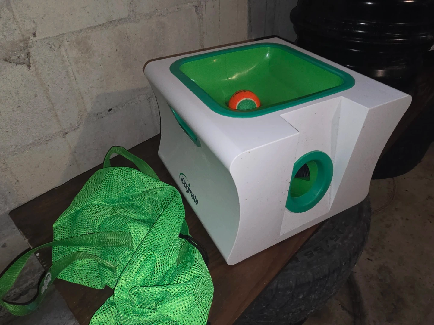 This is the iDogmate automatic dog ball launcher. It comes with a green mesh bag for easy transport. Perfect for keeping your furry friend entertained indoors or out!