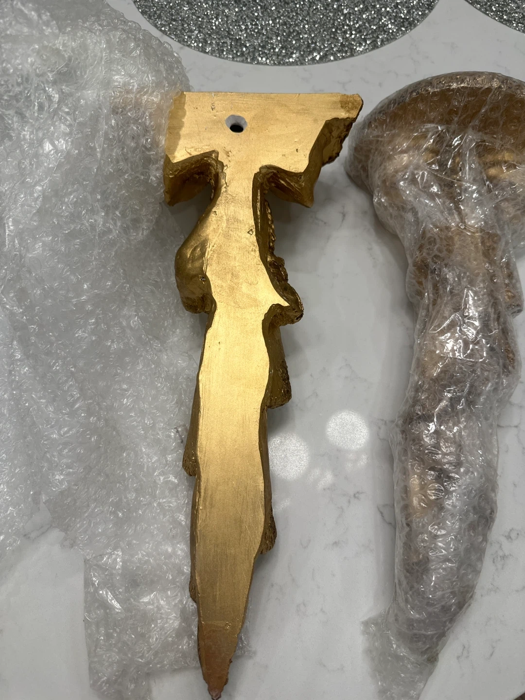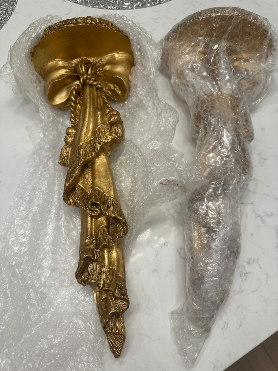 This is a pair of decorative wall shelves, finished in a gold colour with ornate detailing and a tassel-like design. Each shelf measures approximately 12 inches long and 6 inches deep. They're perfect for displaying small decorative items.