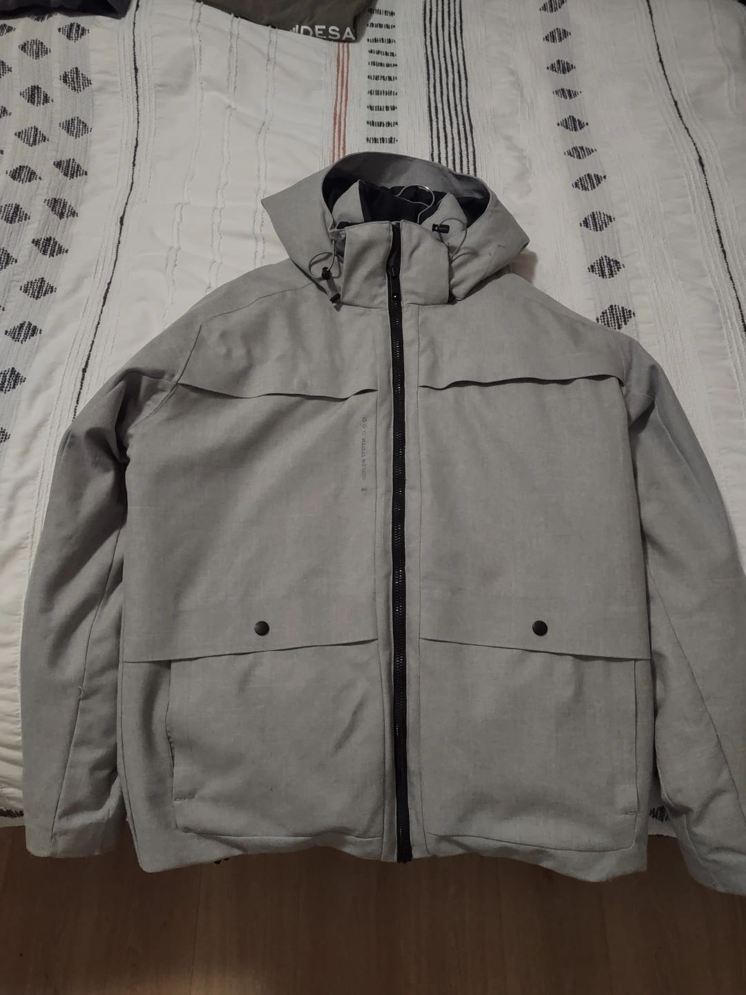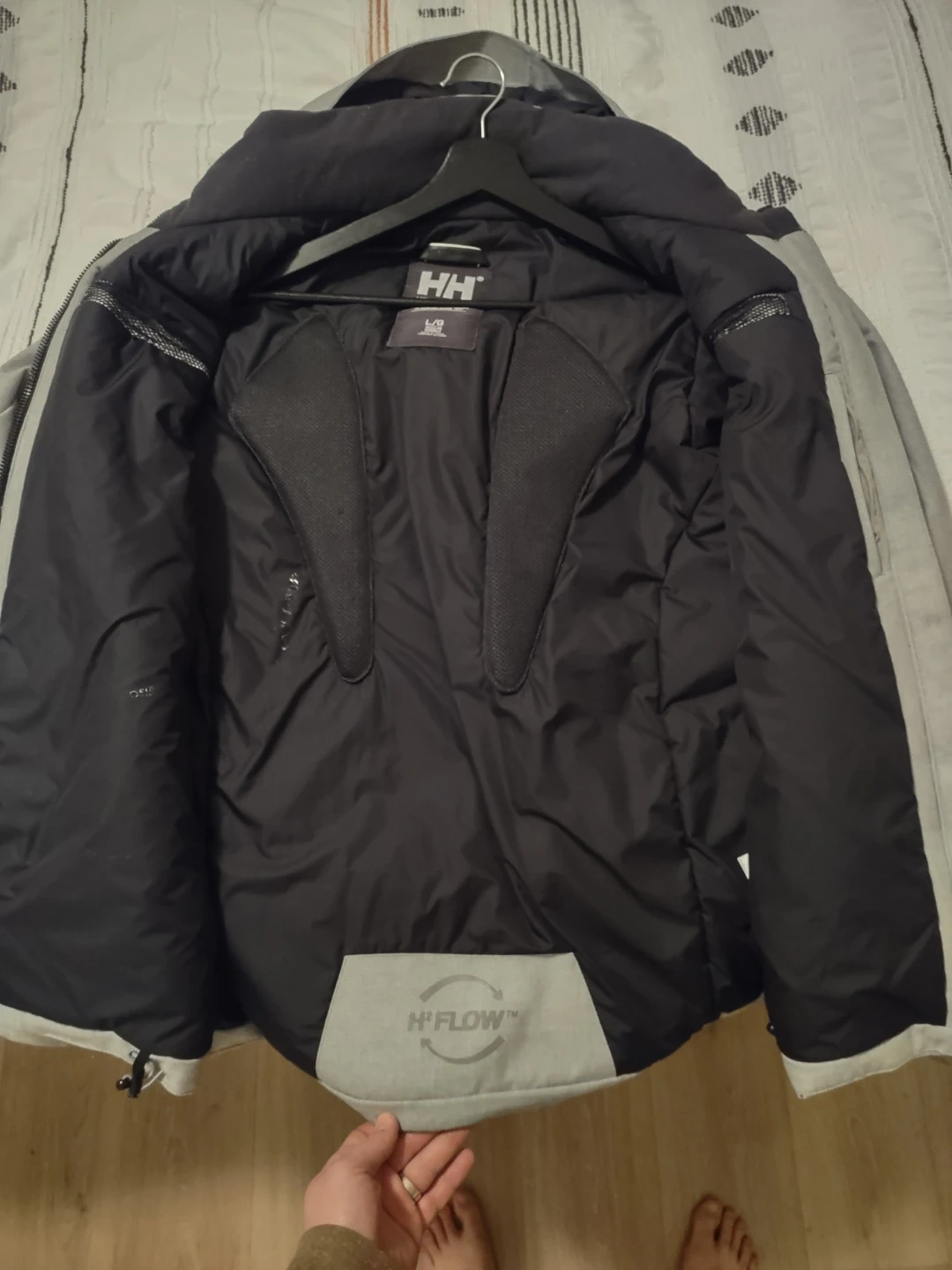 Helly Hansen men's insulated jacket in a light grey colour. It's a ski jacket with HH-Flow technology. This jacket is designed for cold weather activities.