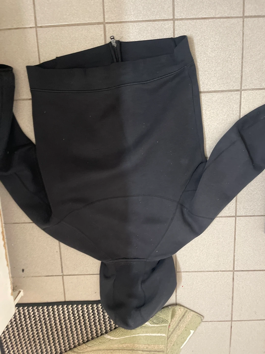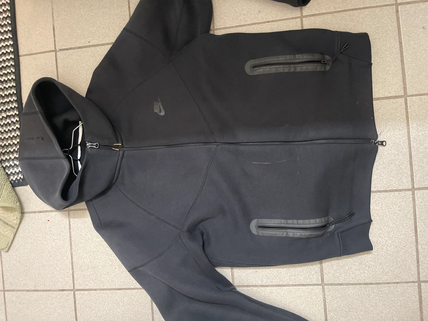 Black Nike Tech Fleece hoodie with zippered pockets. It's made for warmth and comfort. Great for casual wear or training!