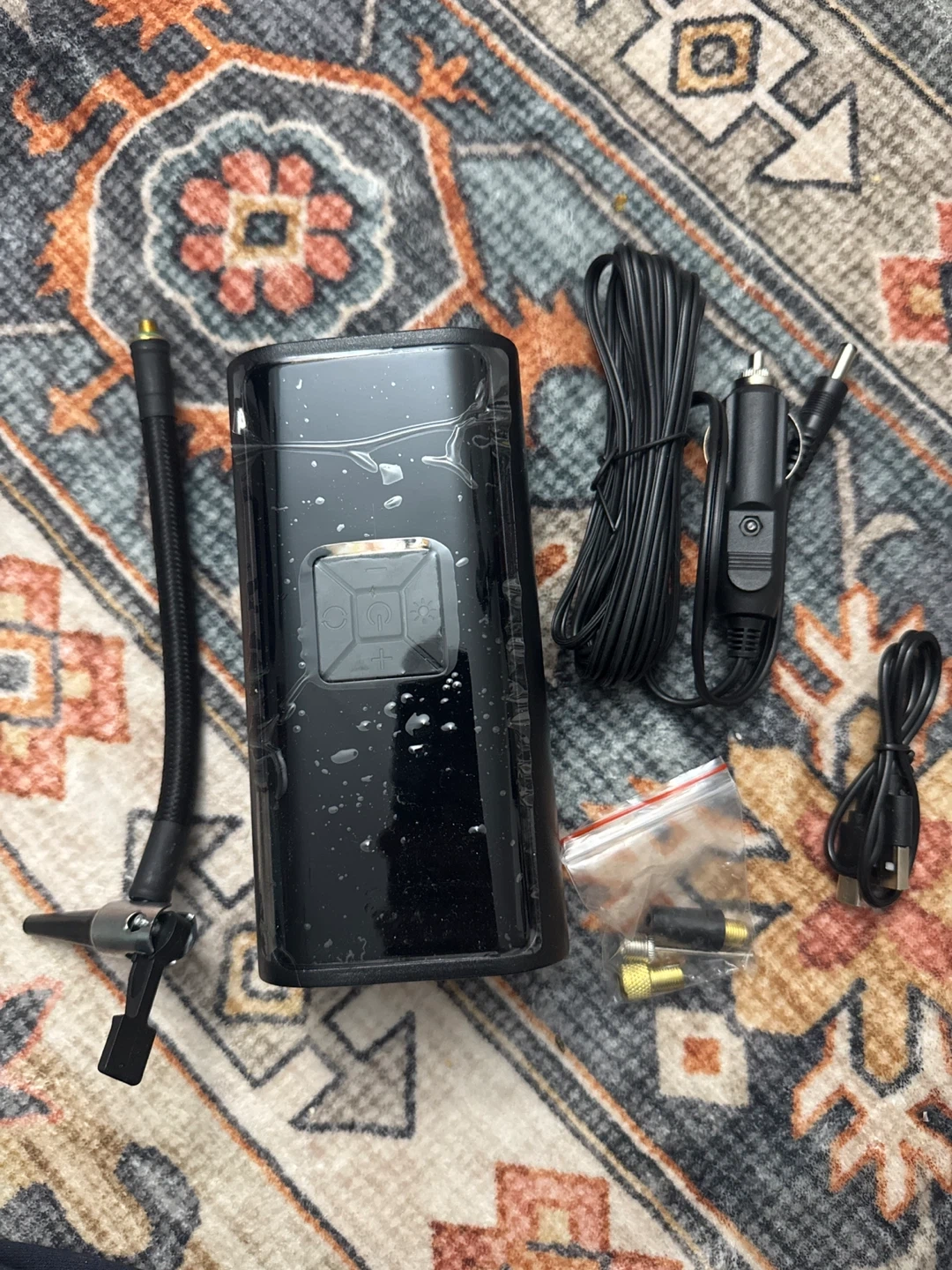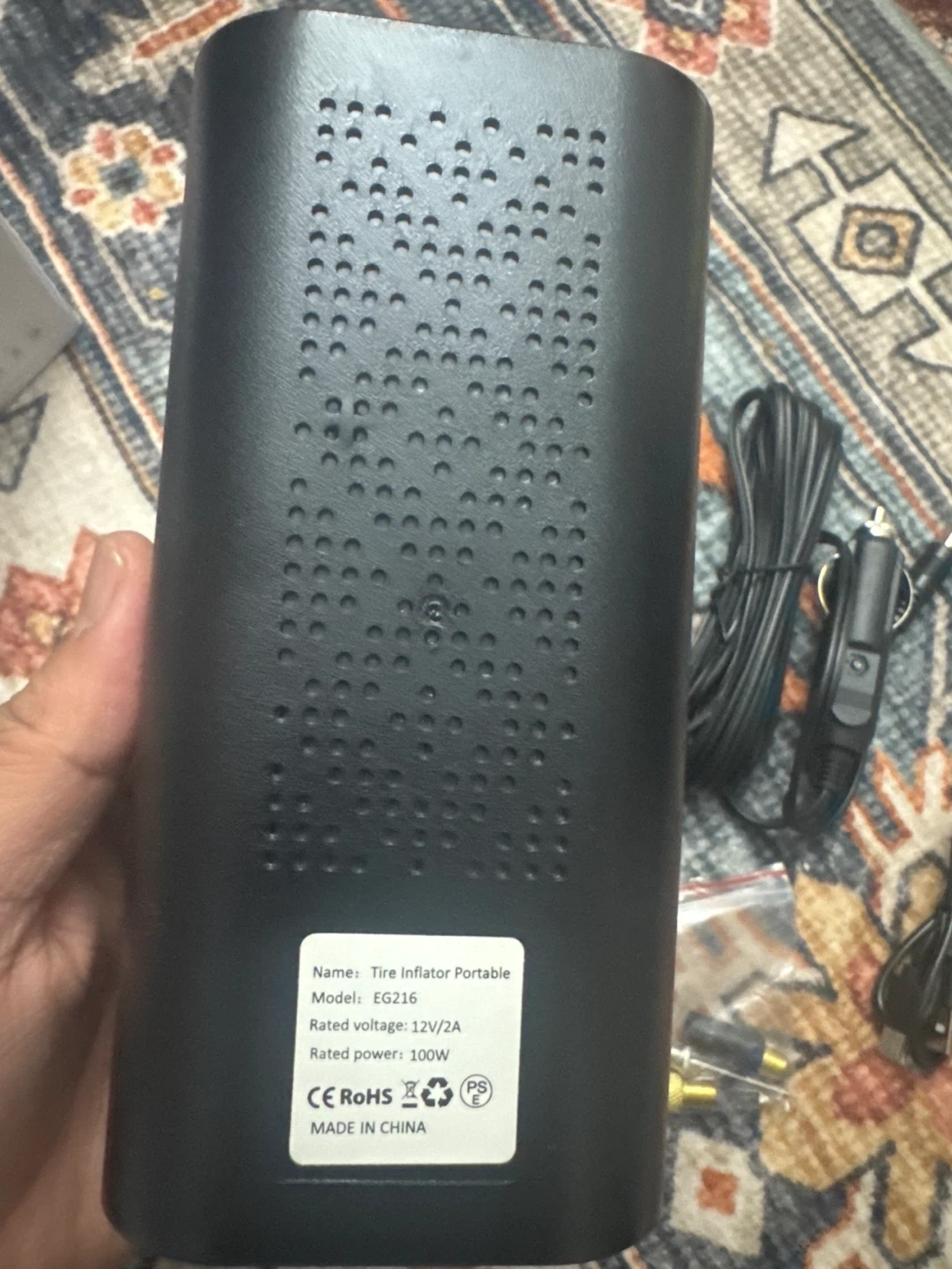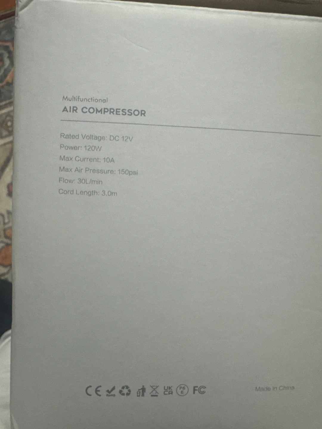 This multifunctional air compressor has a digital display and comes with various nozzles. It operates on 12V DC power with a maximum pressure of 150psi and a flow rate of 30L/min. The cord length is 3.0m.