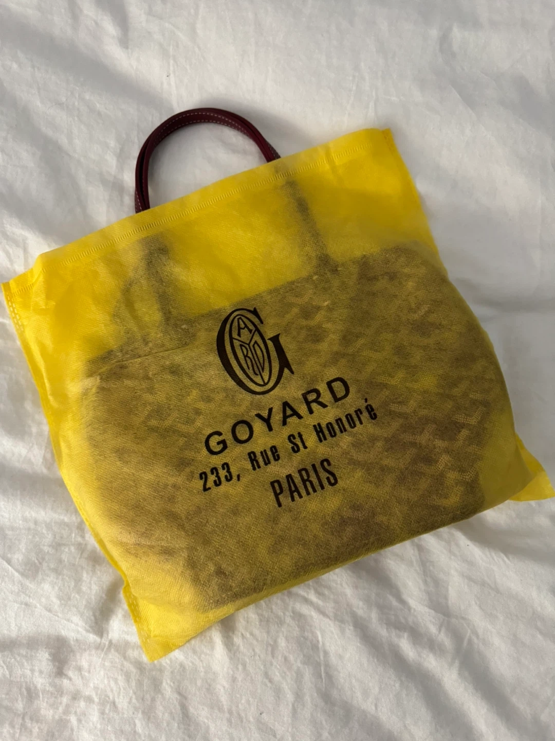 Tote bag in burgundy (small). It's made of coated canvas with leather trim. Comes with a matching pouch. Includes dust bag.