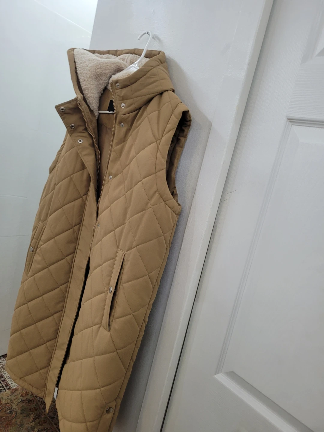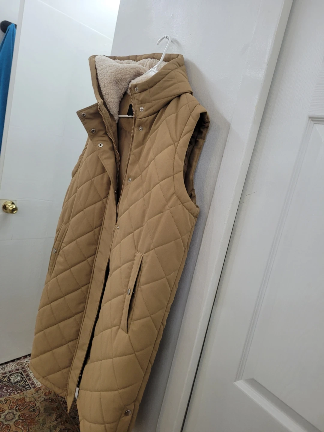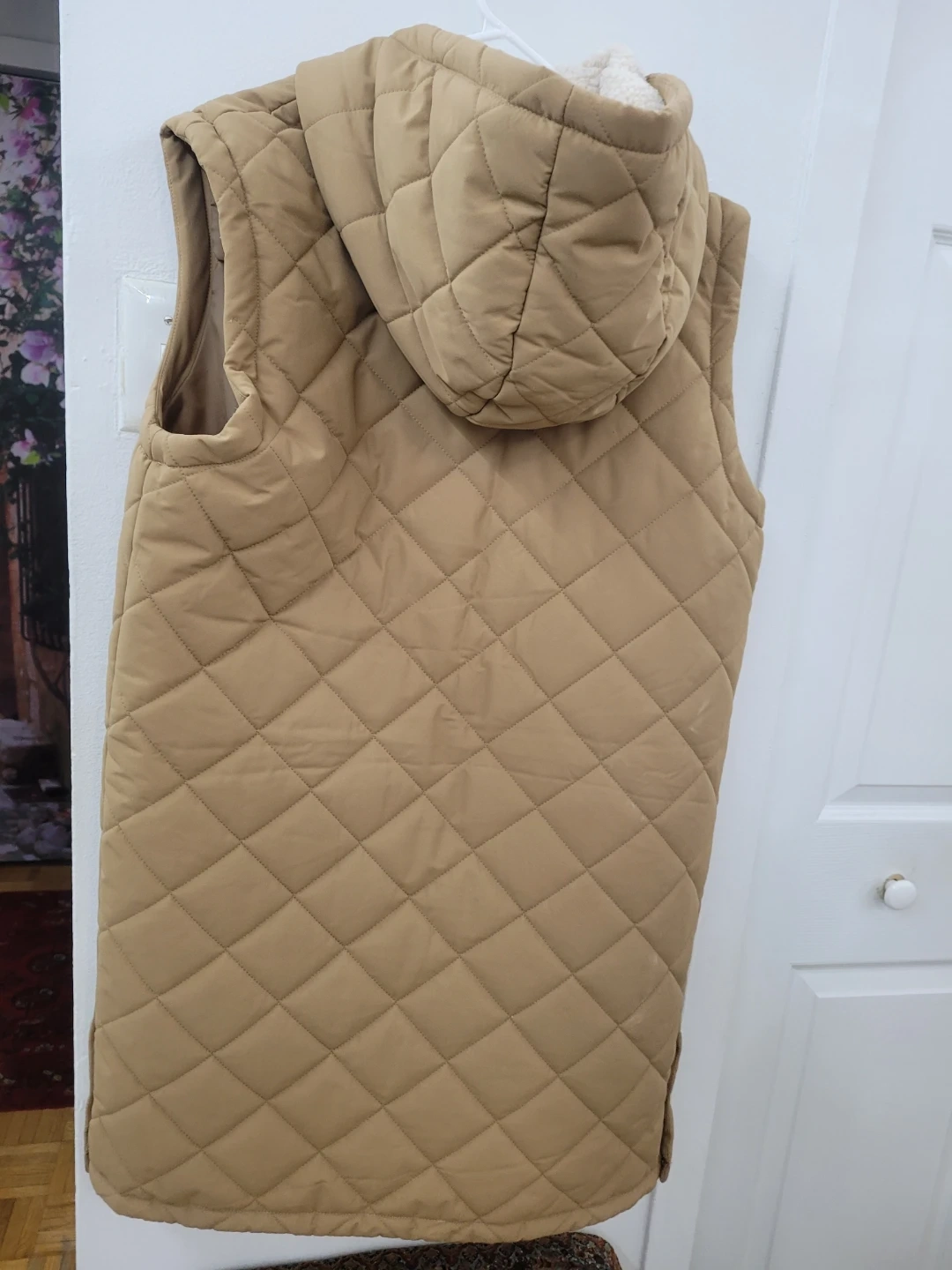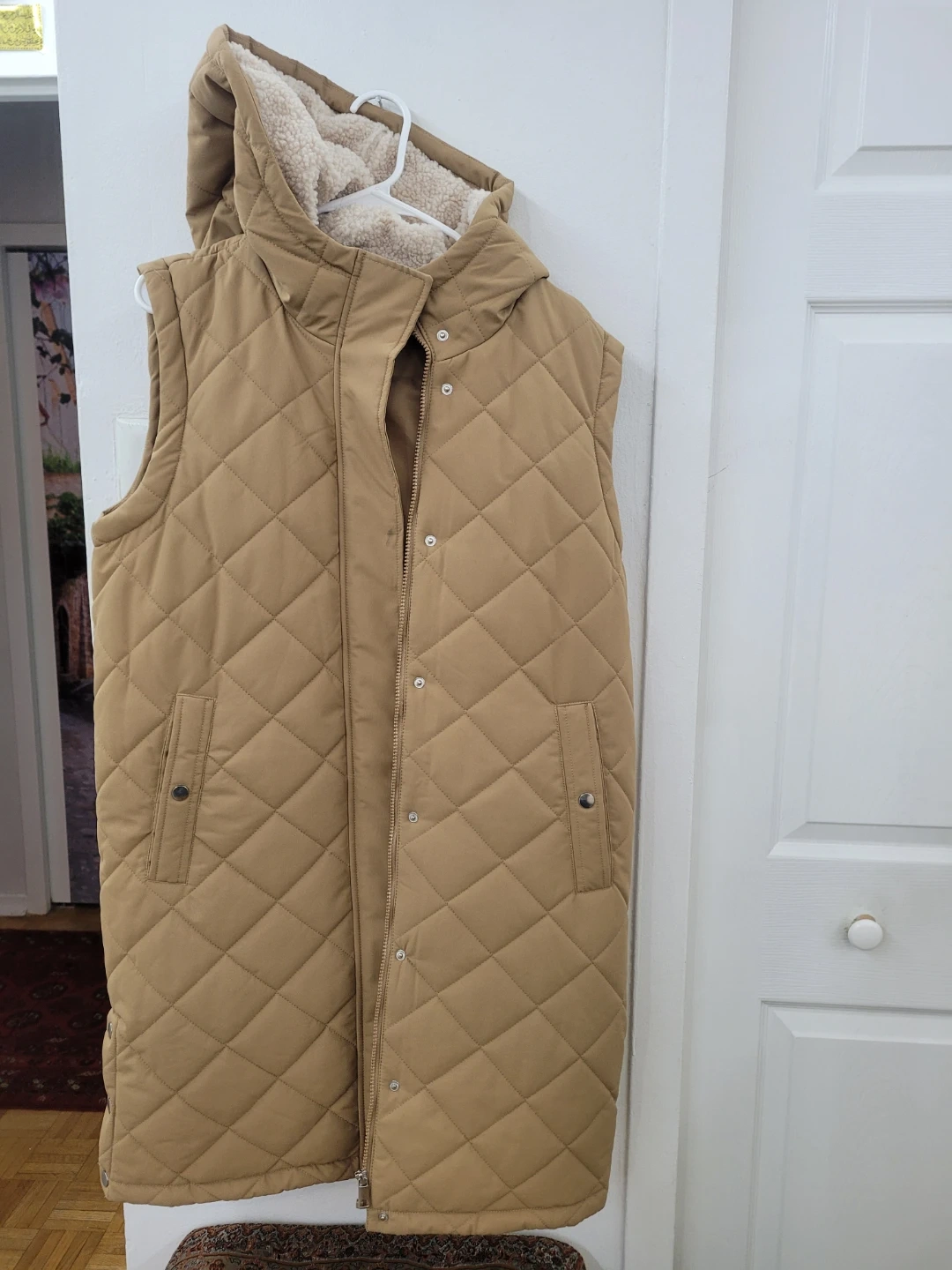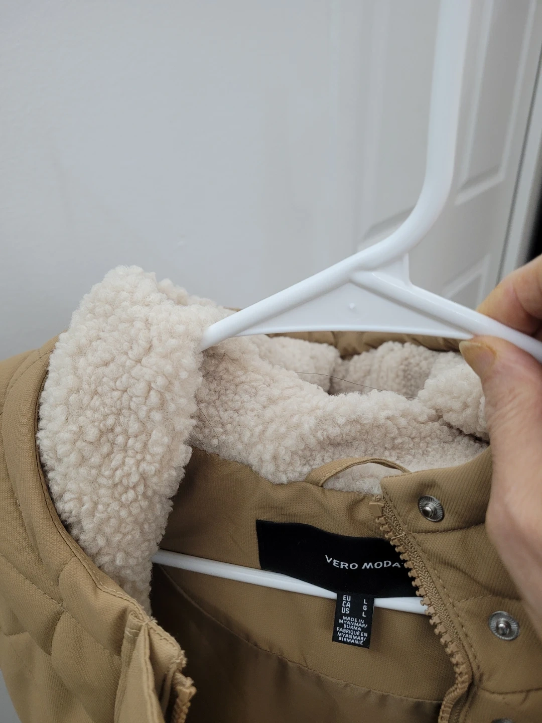 This is a VERO MODA quilted vest with a sherpa lining and hood. It's a camel colour and features a zip and snap closure with pockets. Size is large.