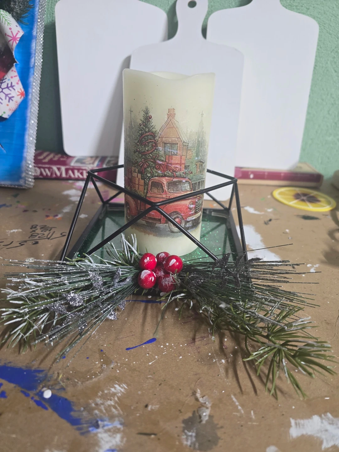 This flameless LED candle features charming Christmas designs, including gnomes and vintage trucks with festive scenes. It's housed in a geometric metal holder decorated with faux pine and jingle bells, creating a cozy holiday ambiance. Perfect for adding a touch of seasonal cheer to your home decor without any fire hazard!