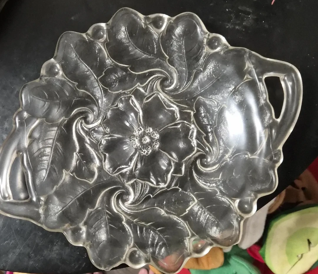 This is a clear glass serving tray with an embossed floral and leaf design. It has two handles for easy carrying. It's a lovely piece for serving appetizers or desserts.