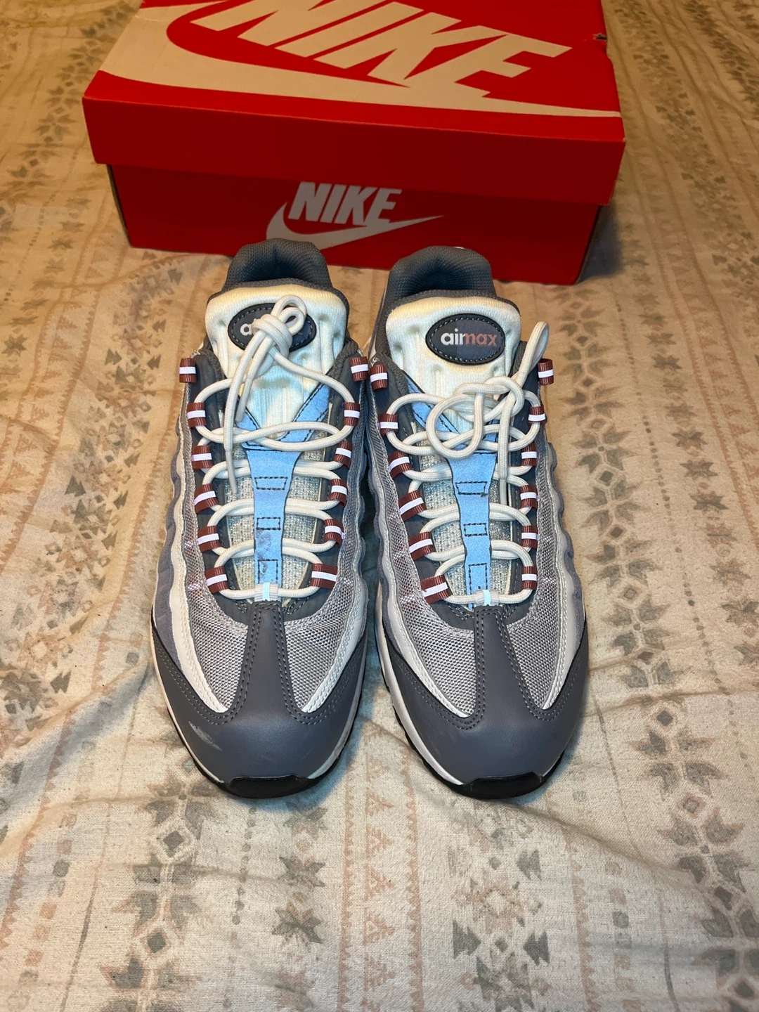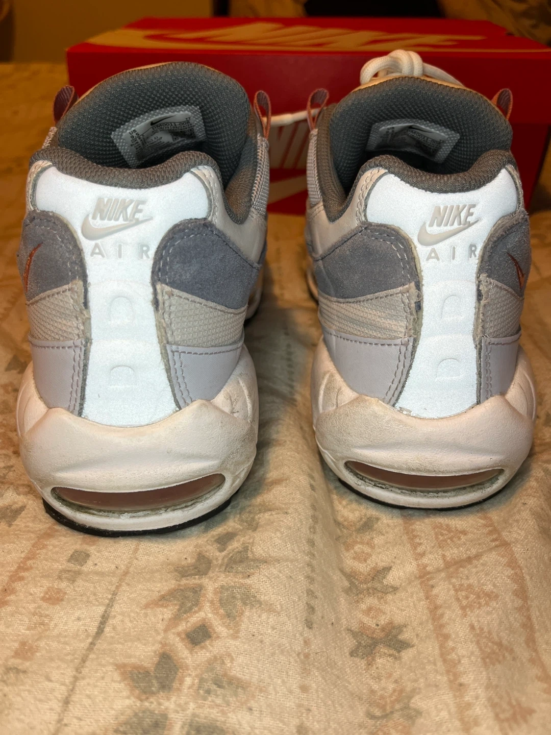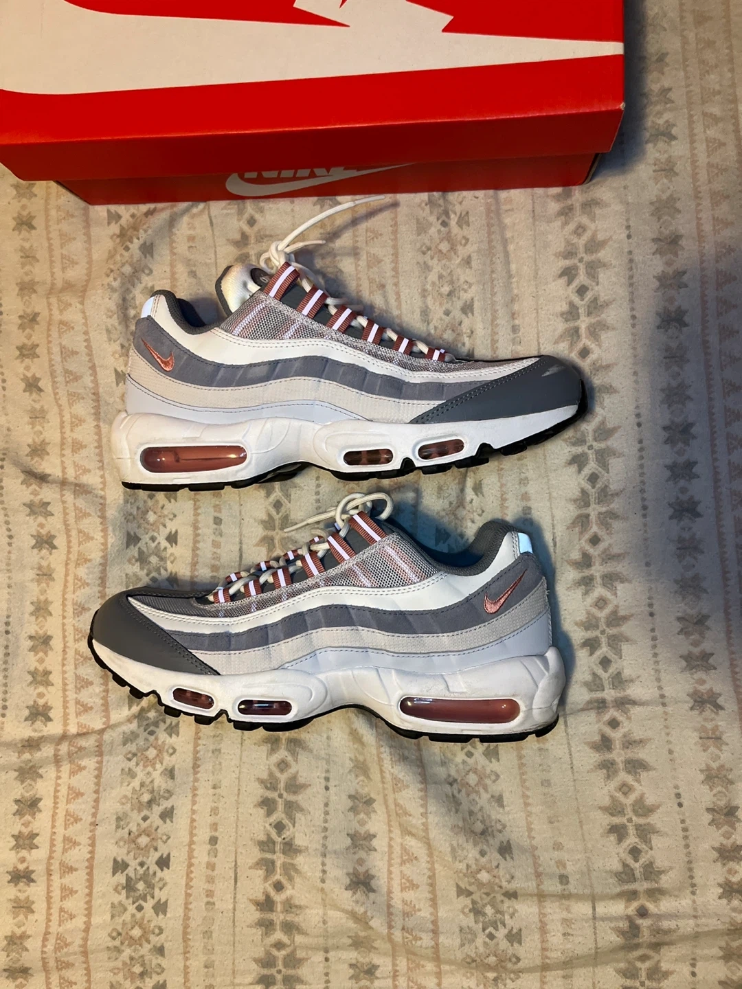 Nike Air Max 95 Stardust OG in Vast Grey/Red Stardust. Size 9.5 men's. These sneakers feature the iconic Air Max cushioning. Includes original box. Small scuffs on right foot shoe // offers may be accepted