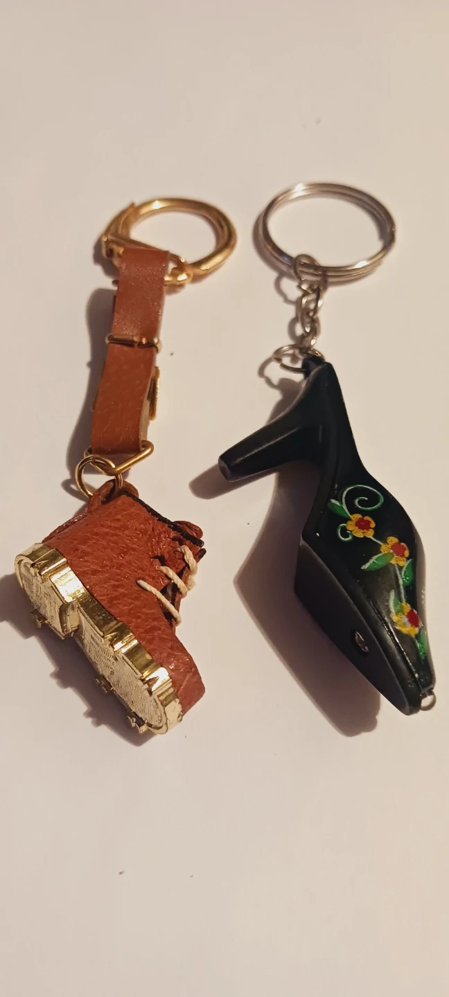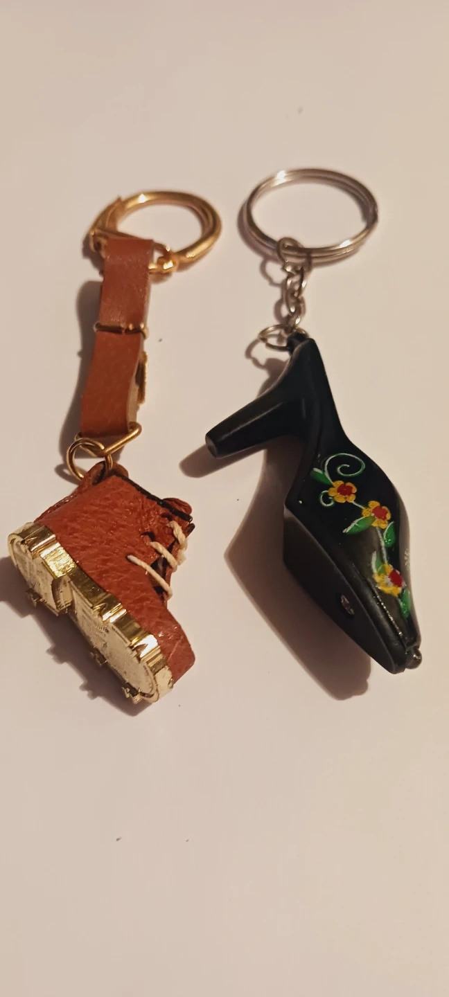 2 × cute keychains with charms. Includes a mini brown leather boot with gold sole and a black high heel shoe with floral painted detail. Perfect for adding a unique touch to your keys or bag! 4"×1". $3 EACH !!